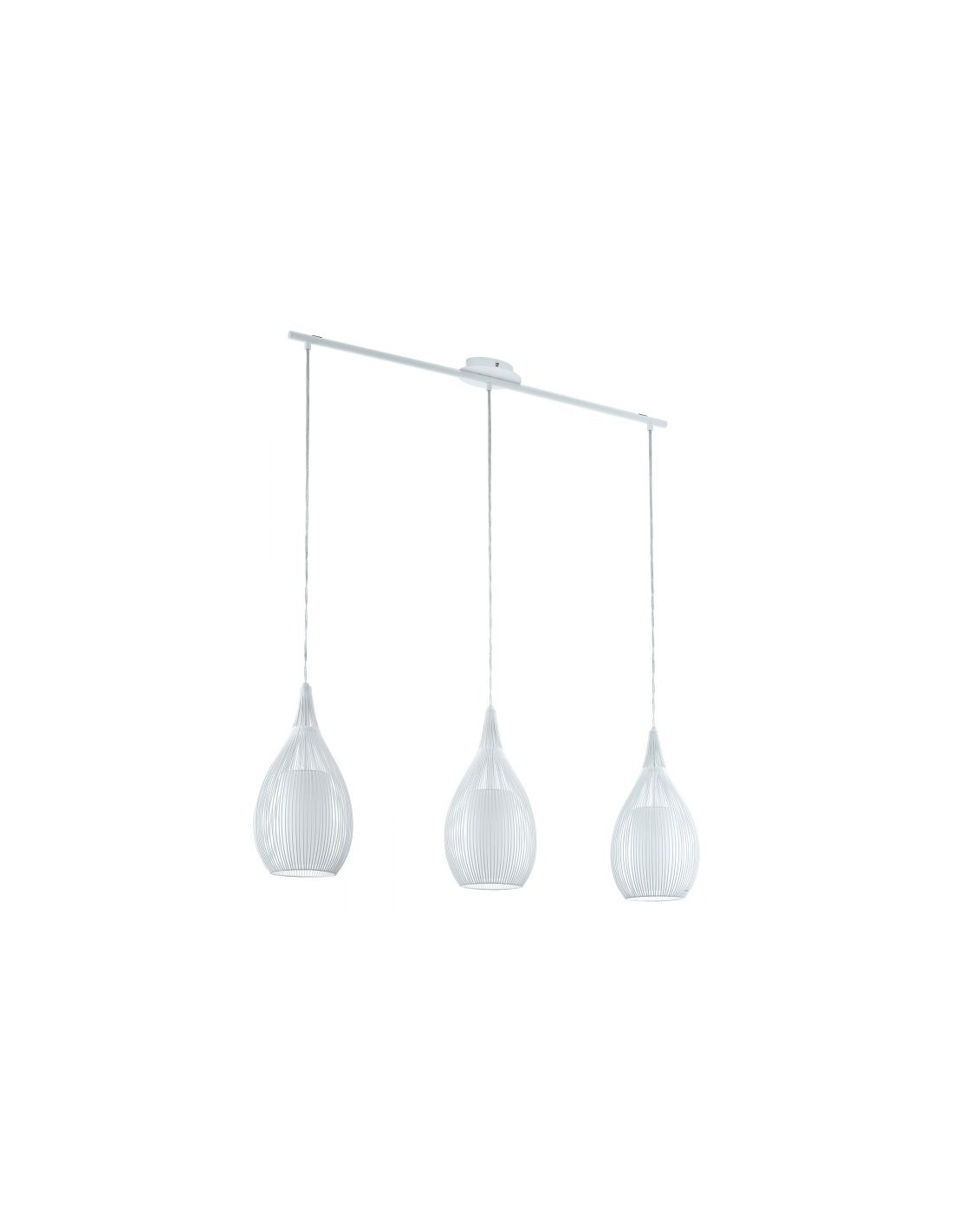 La sospensione RAZONI del brand EGLO presenta una struttura lineare in metallo bianco. Le tre gabbie affusolate racchiudono diffusori in vetro satinato bianco.