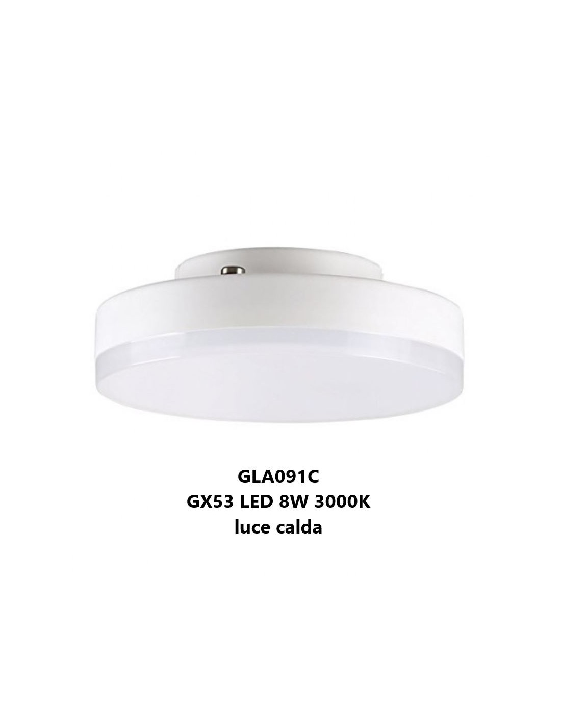 Lampadina a LED piatta attacco gx53 8W 3000K 750Lm (luce bianca calda) con attacco a baionetta. Angolo di amissione luce di 120°.