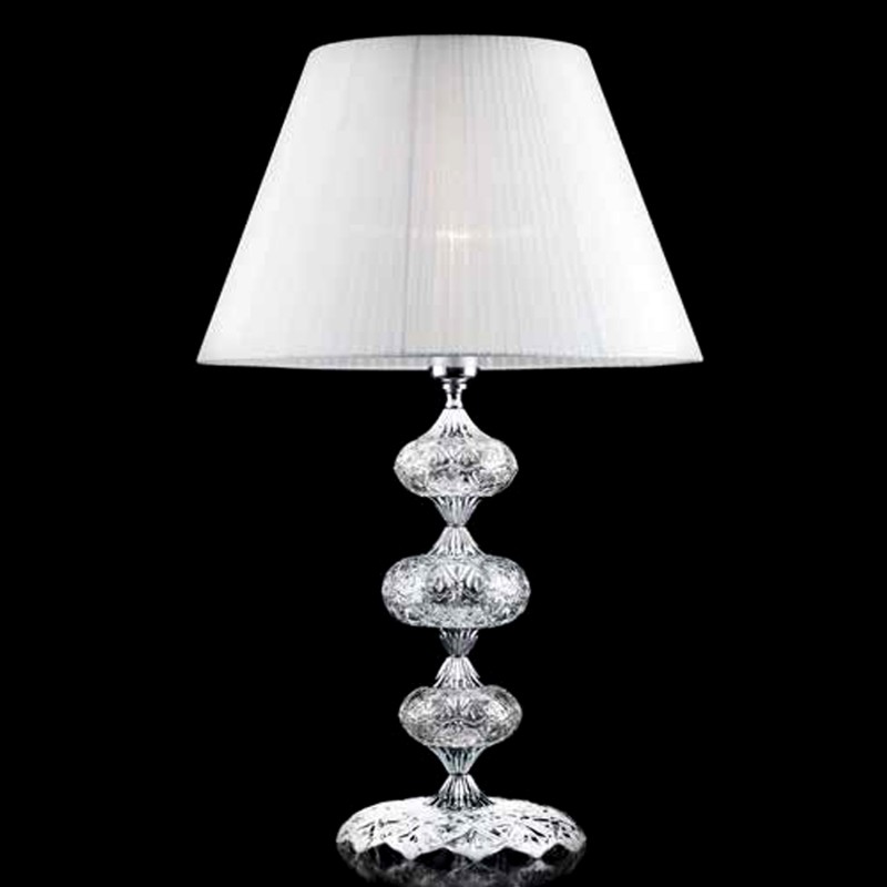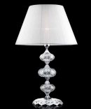 • Questa lampada da tavolo della serie DALLAS é realizzata in vetro e cristallo trasparente con montatura e dettagli in metallo finitura cromo. Paralume in tessuto plissettato bianco.