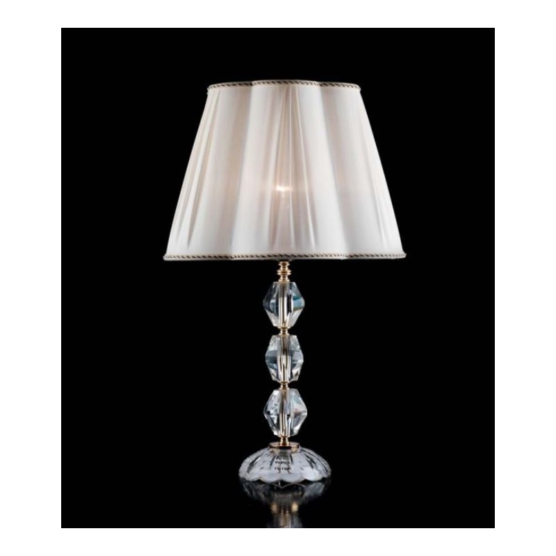 • vetro trasparente e cristallo con montatura in metallo finitura oro e paralume in tessuto avorio.