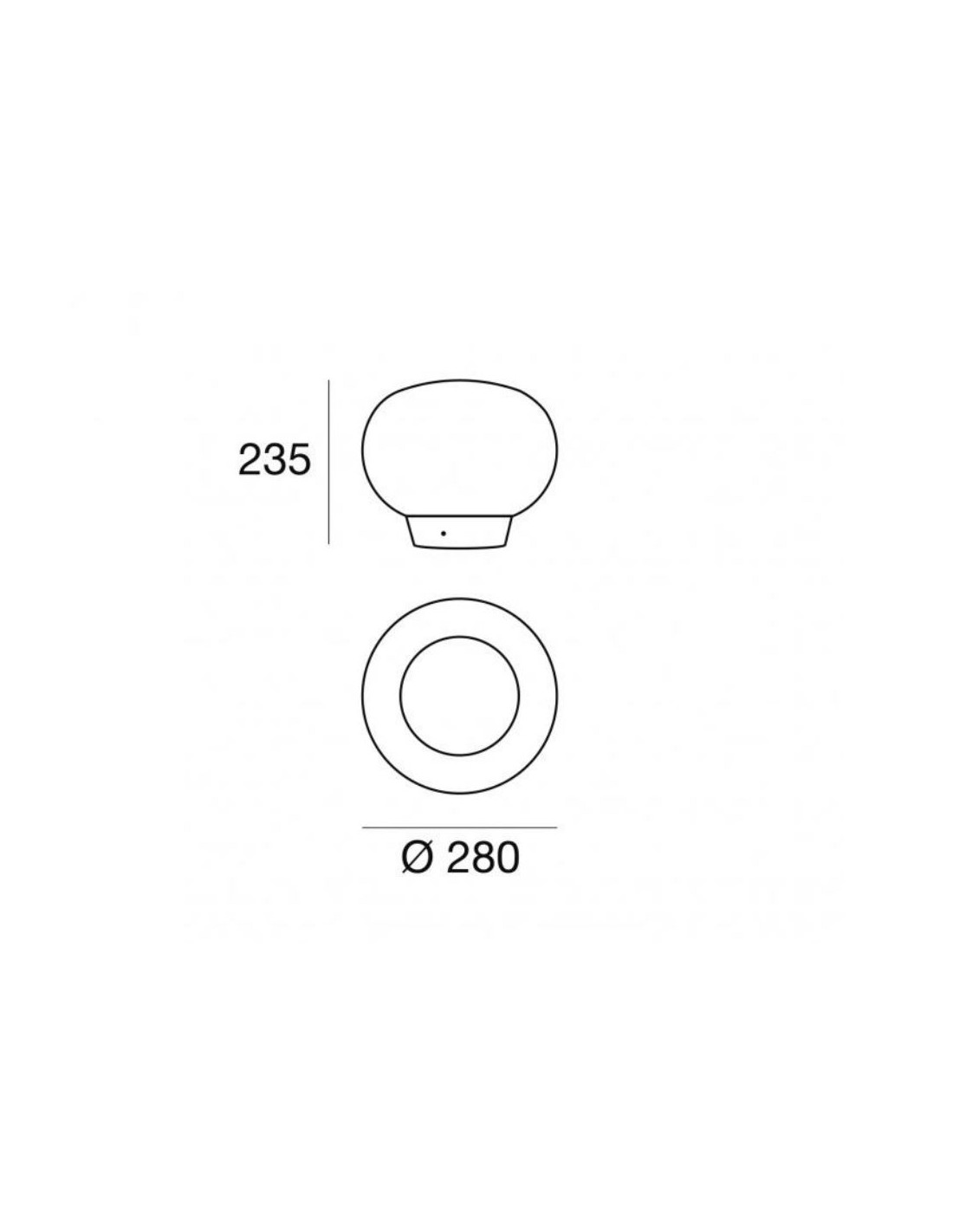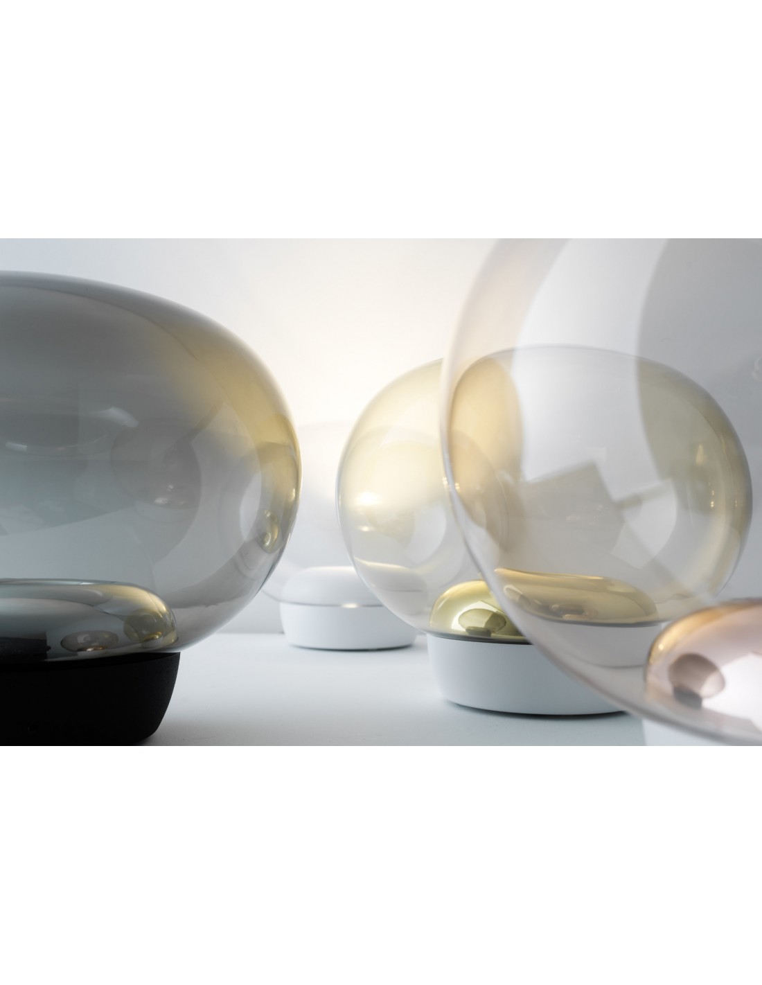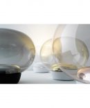 Composta da una base in metallo verniciato bianco e un diffusore sferico ovalizzato in vetro soffiato colore oro. Disponibile nelle varianti trasparente, fumé, oro oppure ramato.