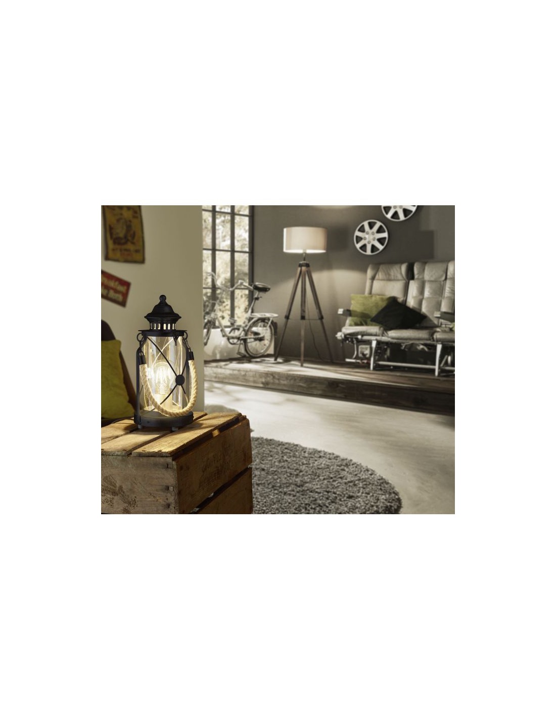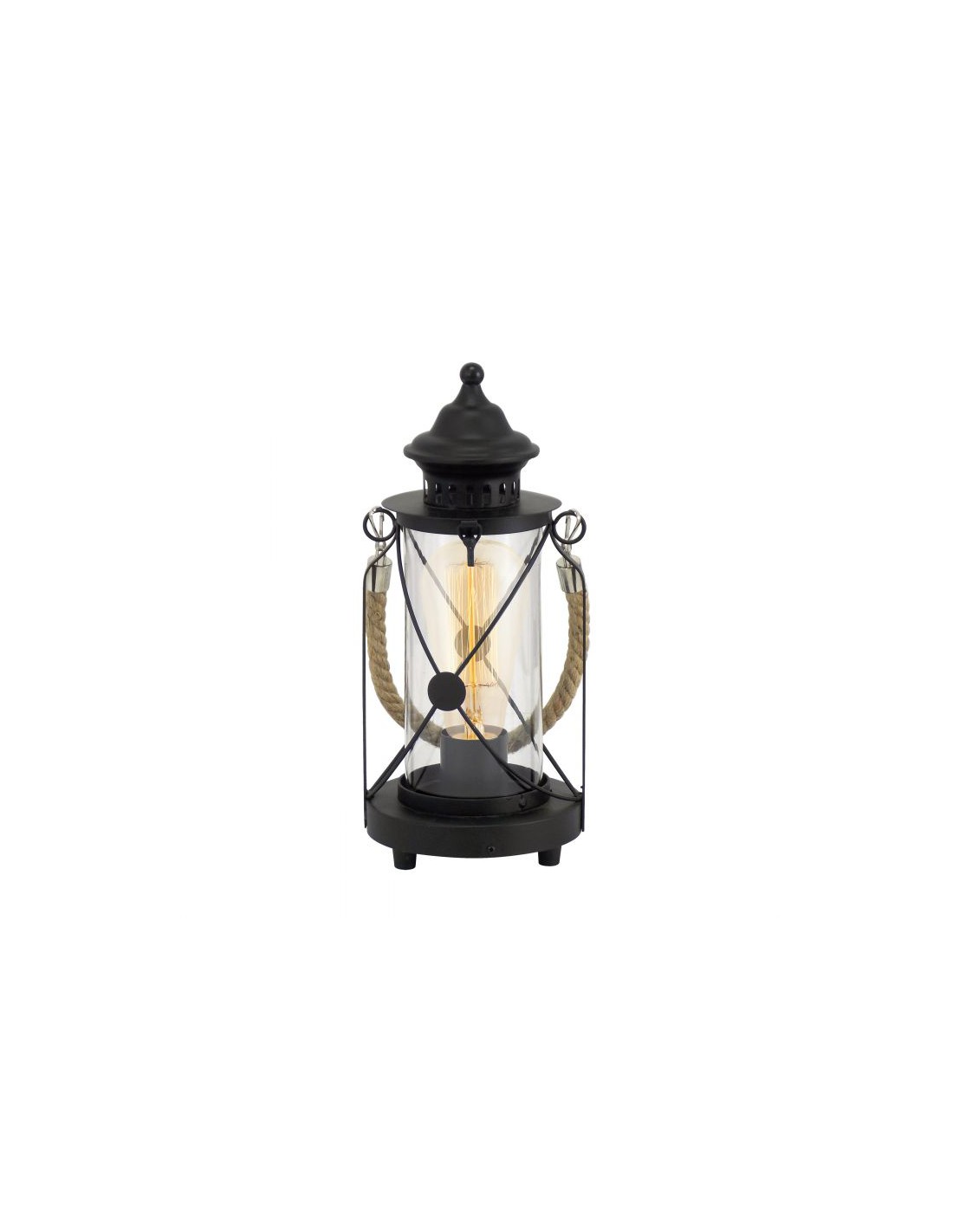 La lampada da tavolo BRADFORD del brand EGLO è composta da una montatura in metallo nero e diffusore in vetro trasparente che richiama l’idea di una piccola lanterna in stile vintage.