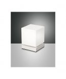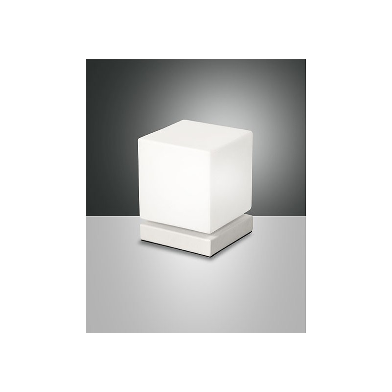 - Il lumetto Brenta presenta una base in metallo su cui é montato un cubo realizzato in vetro soffiato bianco.