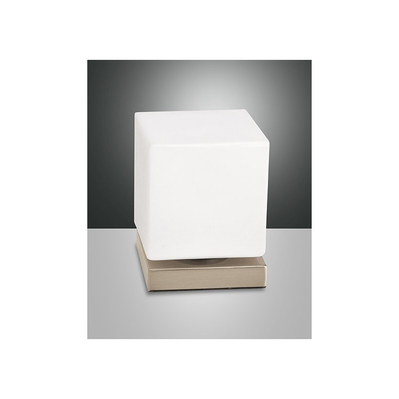 - Il lumetto Brenta presenta una base in metallo su cui é montato un cubo realizzato in vetro soffiato bianco.