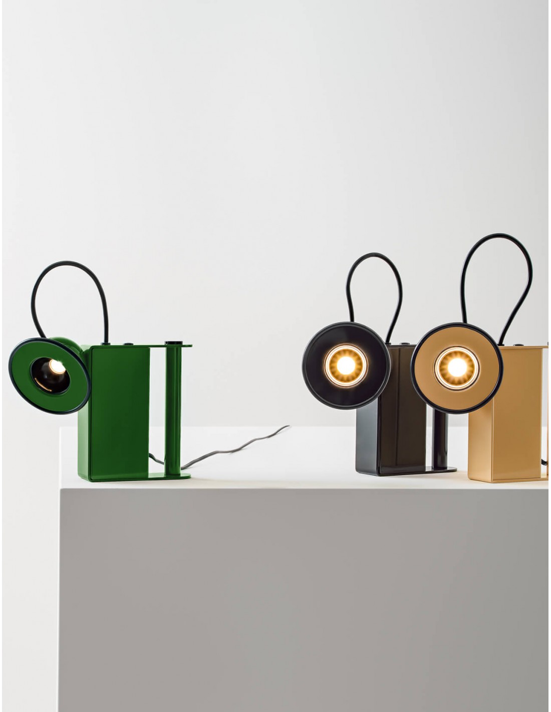 La lampada da tavolo MINIBOX, ideata nel 1981, richiama l’idea di lanterna dei minatori, un piccolo elemento luminoso che combina diversi stili, dal vintage al retrò sino al moderno.