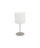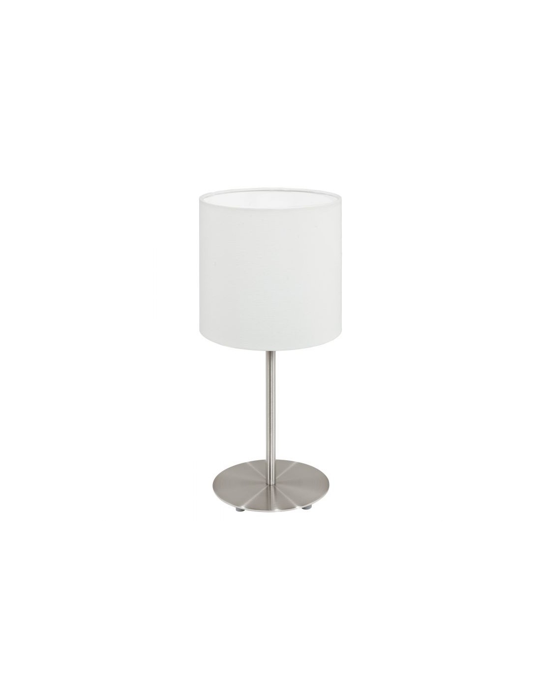 La lampada da tavolo Pasteri del brand EGLO presenta un profilo in metallo finitura nichel opaco con diffusore cilindrico in tessuto di lino colore bianco.