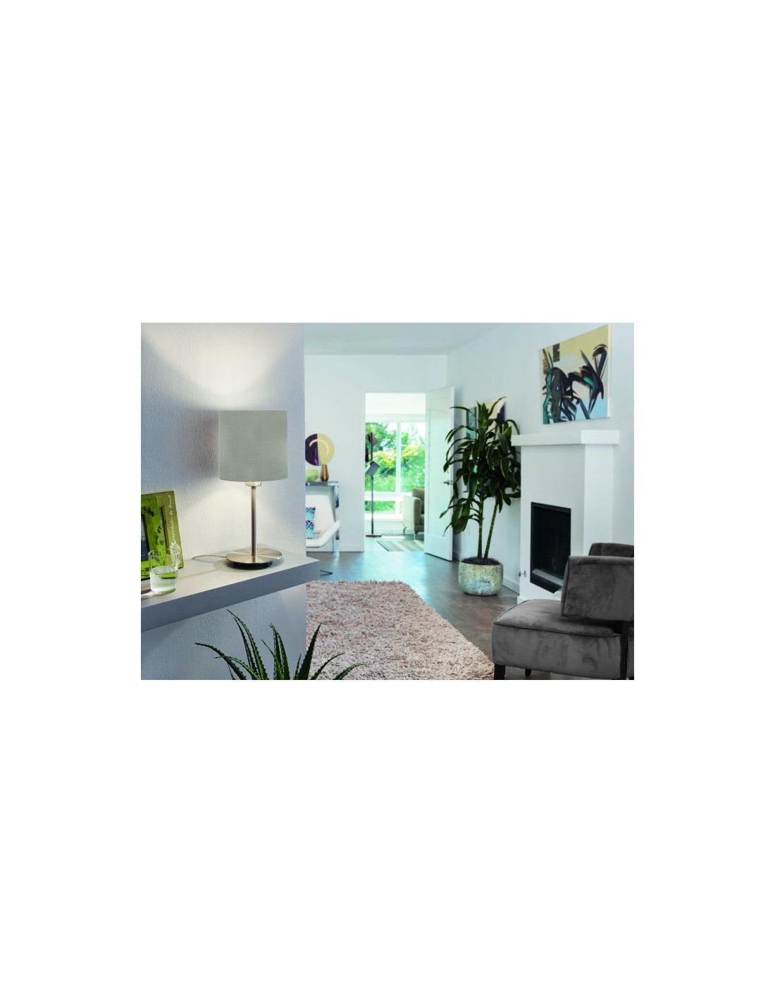 La lampada da tavolo PASTERI del brand EGLO presenta un profilo in metallo finitura nichel opaco con paralume cilindrico in tessuto di lino colore taupe.