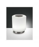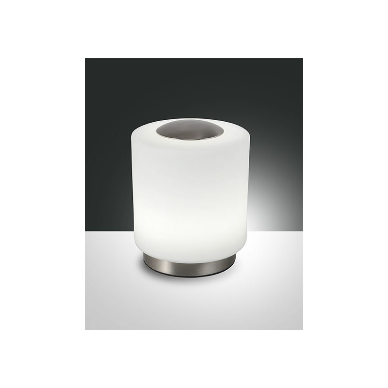 • La lampada da tavolo Simi é composta da una struttura in metallo disponibile nelle finiture cromo e nichel satinato, con diffusore cilindrico in vetro soffiato bianco.