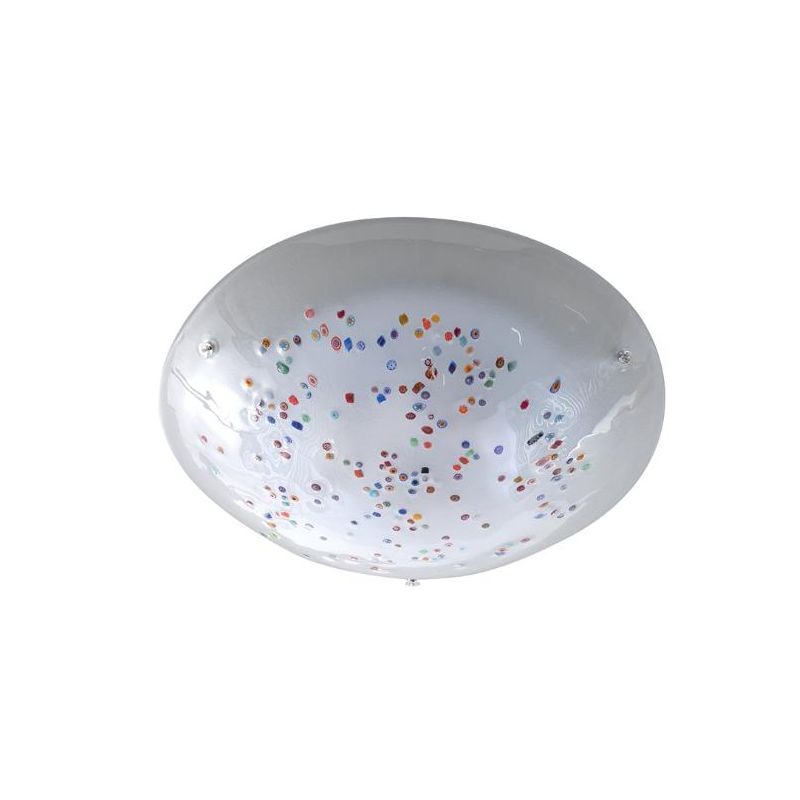 Plafoniera MIRIAM di PADANA LAMPADARI dallo stile classico, con diffusore rotondo del diametro di cm 50, prodotto in vetro sabbiato, lavorato in piastra, con l’applicazione di murrine decorative di varie colorazioni e con dettagli in metallo cromato. Questa è una lampada che offre una buona luminosità all’ambiente ed è particolarmente consigliata per illuminare gli ingressi o i corridoi, il salotto, la cucina, la camera da letto ma anche un ufficio. Questa plafoniera è dotata di 3 portalampade con attacco E27 dove c’è la possibilità di inserire anche le nuove lampadine led a basso consumo energetico del colore e della potenza che più vi necessita e vi gusta.