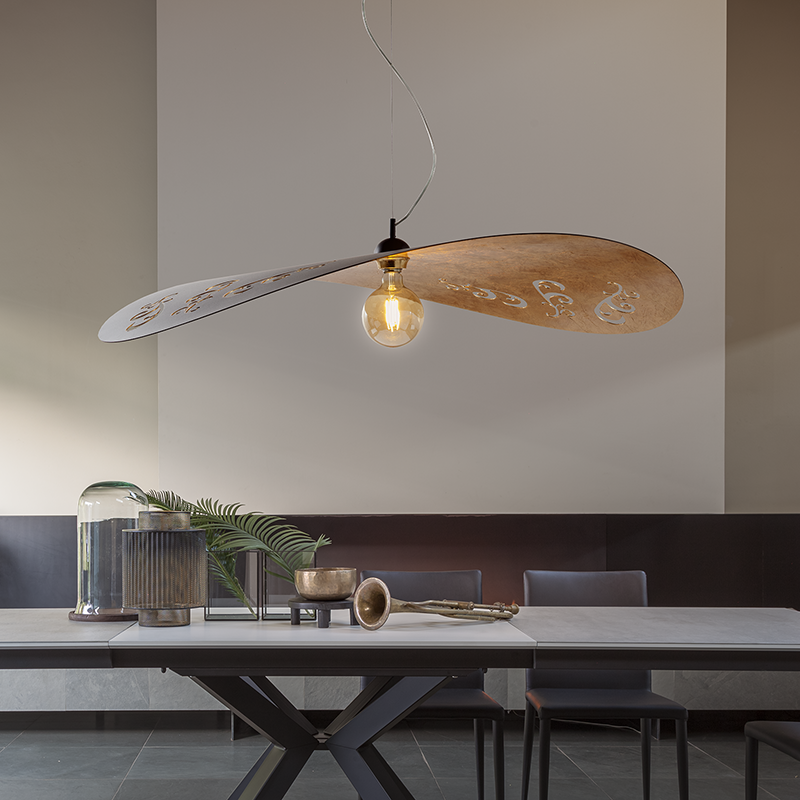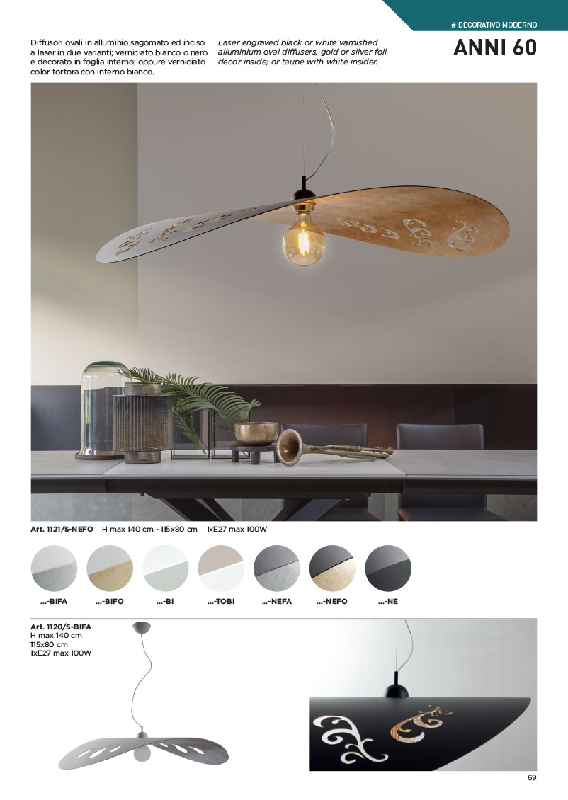 Sospensione ANNI 60 di PADANA LAMPADARI, dallo stile decorativo contemporaneo e moderno con diffusori ovali in alluminio sagomato ed inciso a laser in due varianti, verniciato bianco o nero e decorato in foglia interno, oppure verniciato color tortora con interno bianco