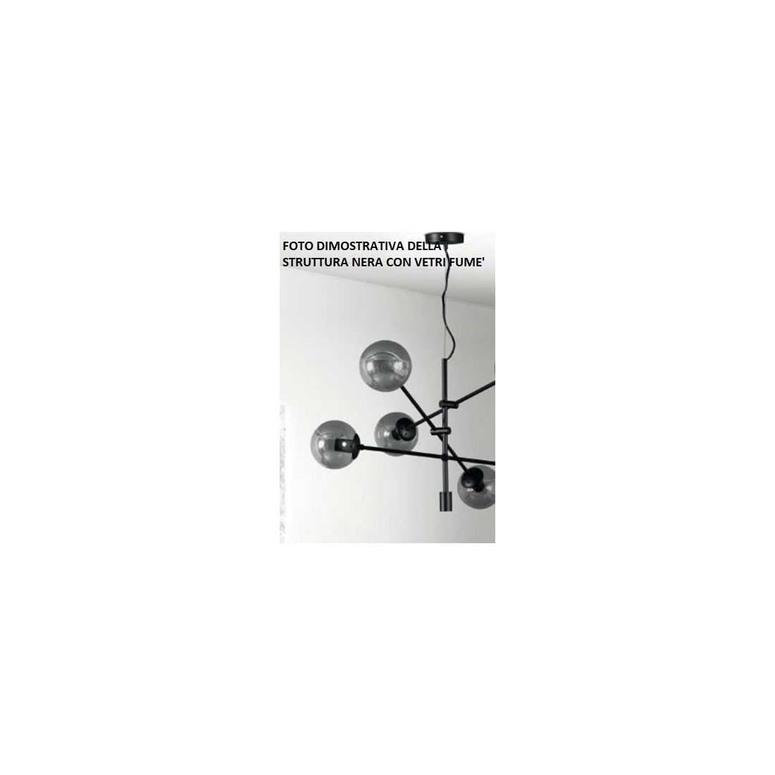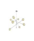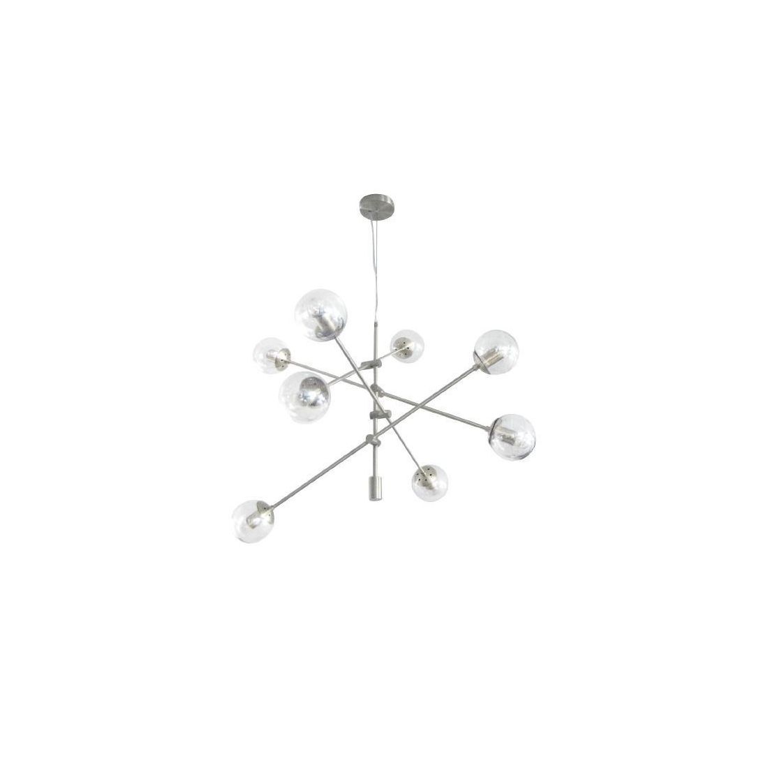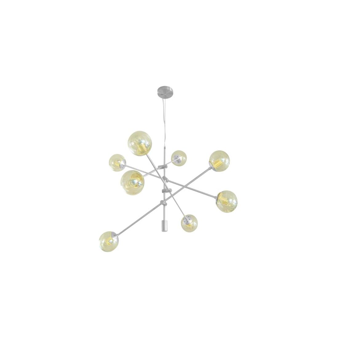 La sospensione GIOKO di PADANA LAMPADARI, dal design moderno composto da una base a soffitto rotonda, da un elemento tubolare centrale a cui sono fissate delle asticelle, il tutto in metallo con finitura Cromo, Bianca o Nera (a vostra scelta) che terminano con gli 8 diffusori a sfera in vetro soffiato decorato fumè, nella struttura nera, decorato ambra nella struttura bianca oppure vetro trasparente nella struttura cromo.