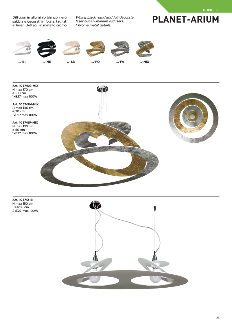 La sospensione PLANET-ARIUM. di PADANA LAMPADARI, è dotata di  diffusori in alluminio verniciato bianco, nero o sabbia e decotrati in foglia oro/argento Linea moderna, innovativa e di grande impatto visivo, per ambienti contemporanei dal design minimal.