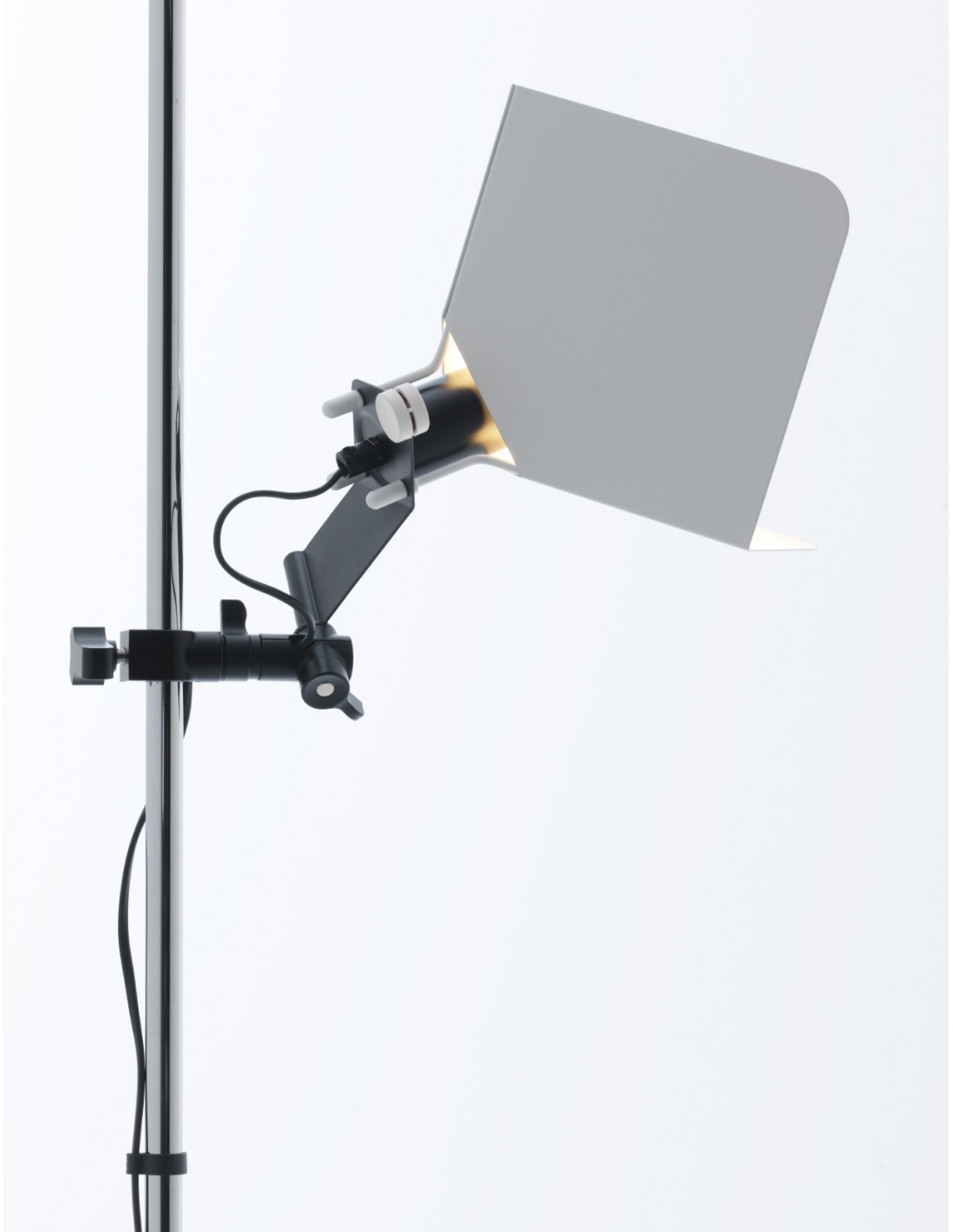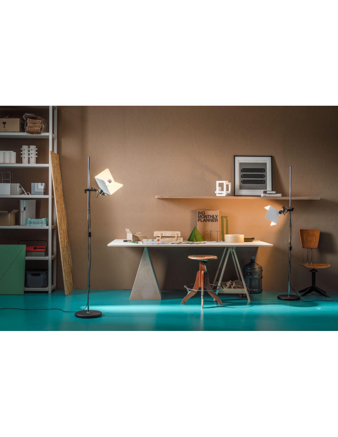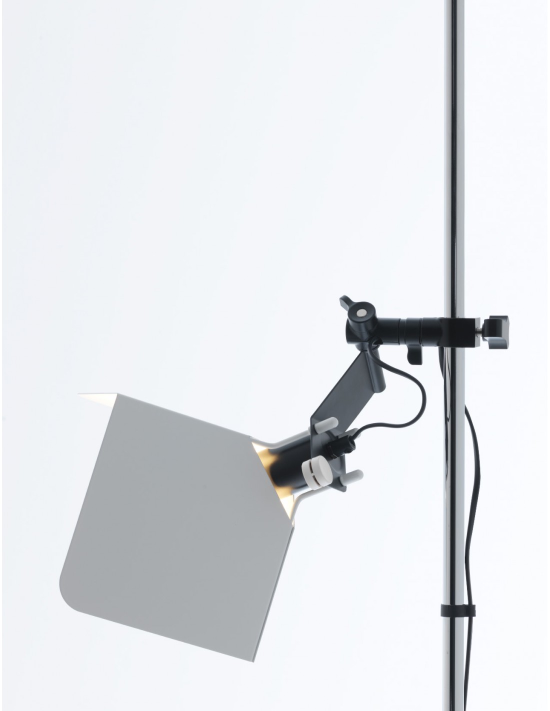 Ideata nel 1970 da Joe Colombo, la serie TRIEDRA è una lampada da terra che ricorda quelle di scena dei set fotografici.