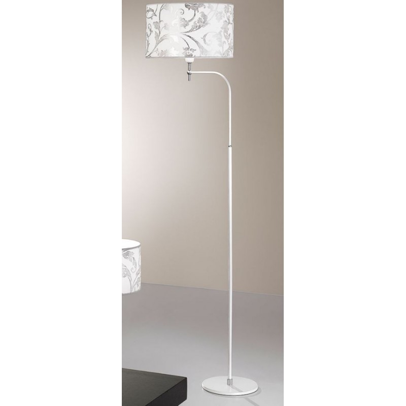 • Lampada da terra con struttura in metallo verniciato bianco con dettagli cromo lucido. Paralume in tessuto bianco arabescato argento.