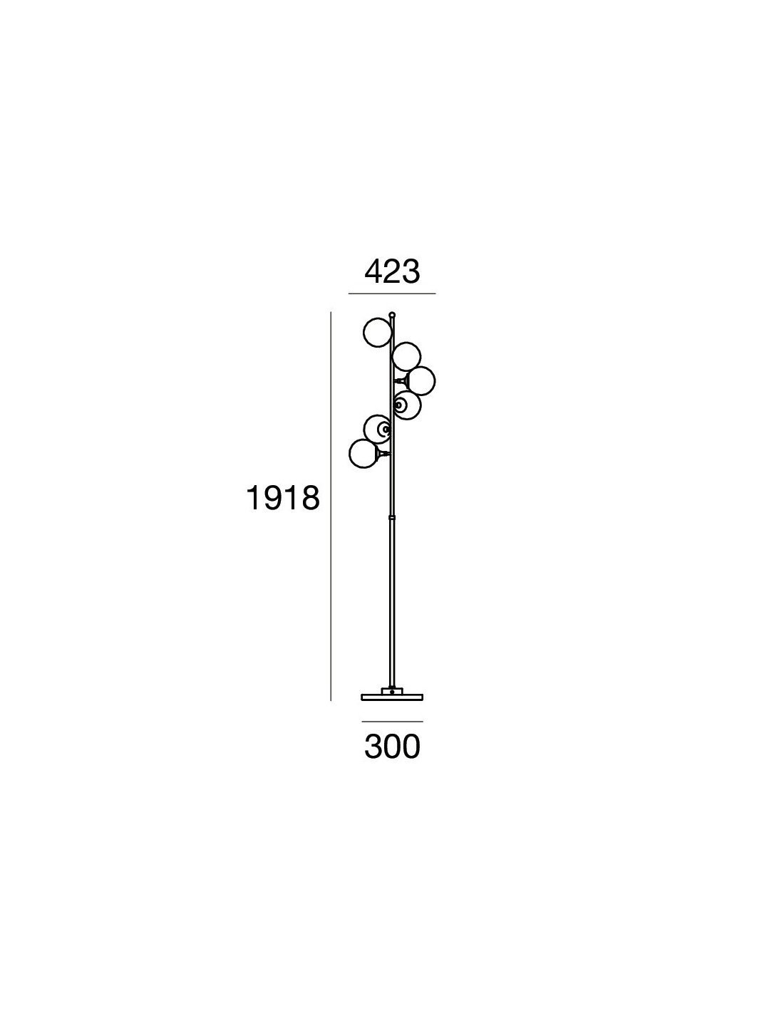 Montatura con base rotonda in marmo bianco di carrara e fusto lineare in ottone rifinito oro tramite galvanostegia. Ad impreziosire la struttura i sei diffusori sferici in vetro triplex bianco lucido.