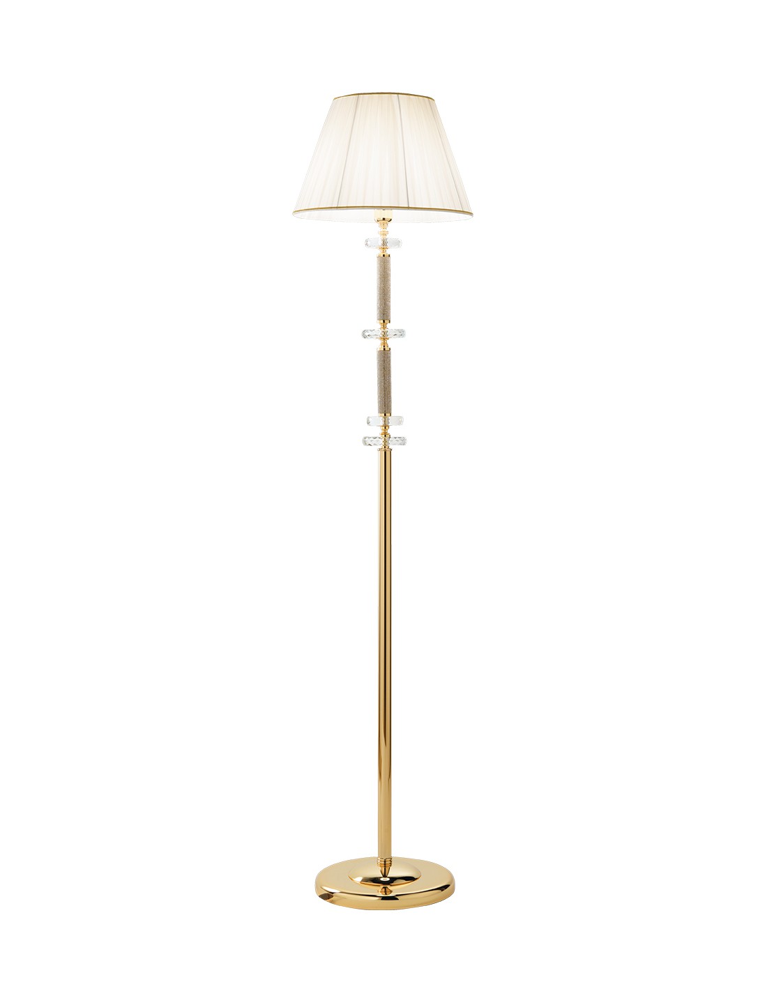- La piantana della serie DIDO é realizzata in vetro trasparente lavorato a mano con montatura in metallo e dettagli in cristallo ottico. Paralume in tessuto bianco.