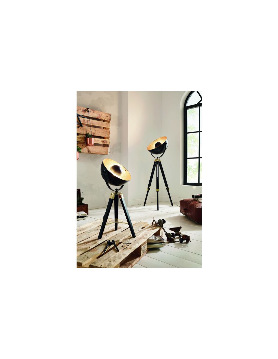 La piantana COVALEDA del brand EGLO presenta una struttura con treppiede in metallo e legno verniciato nero. Il treppiede innitura nero e diffusore orientabile a forma di parabola con interno color oro e dettagli ottone.