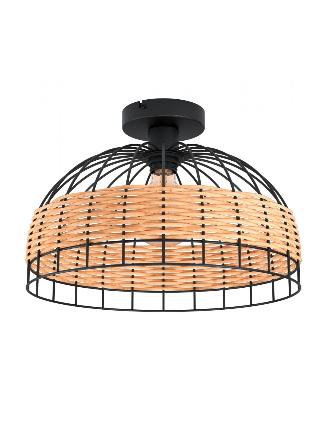 La plafoniera ANWICK del brand EGLO presenta una struttura in metallo finitura nero e diffusore a cupola decorato con intreccio in fibra naturale.