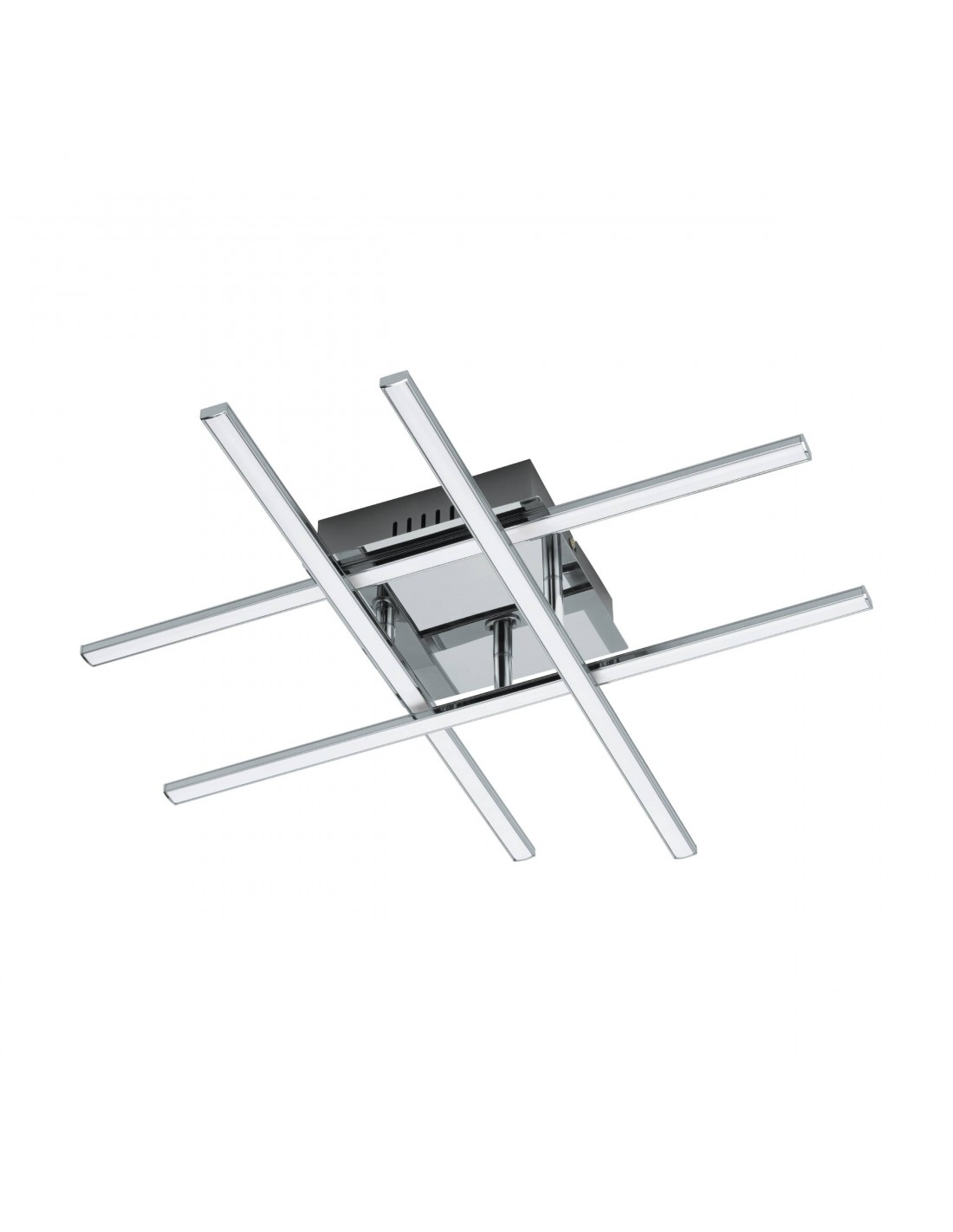 La plafoniera applique LASANA del brand EGLO presenta una struttura in metallo finitura cromata con 4 bacchette led intersecate tra loro in policarbonato finitura bianco.