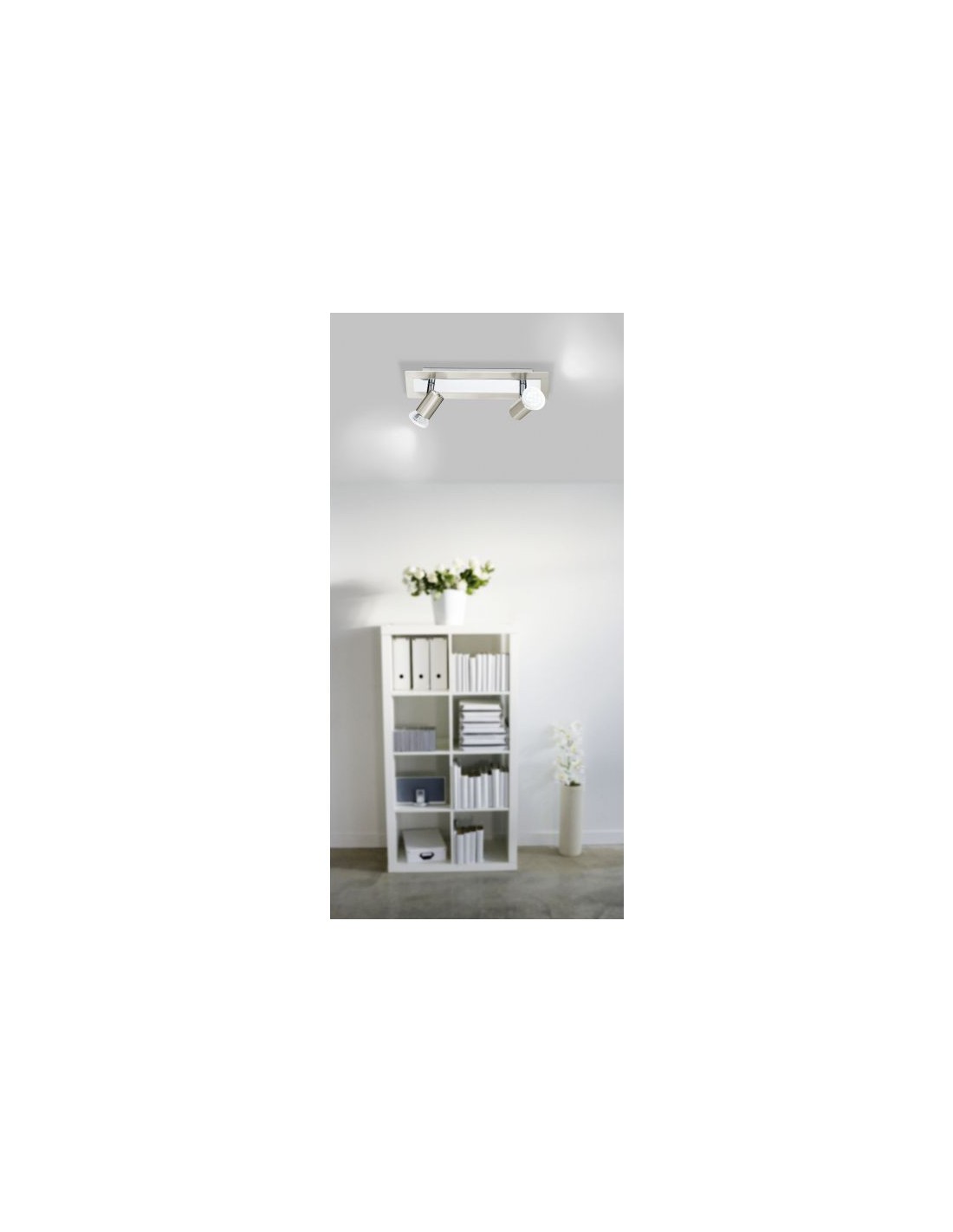 La plafoniera ROTTELO presenta una piastra a soffitto rettangolare in metallo nichel opaco e cromo e doppio faretto spot orientabile.