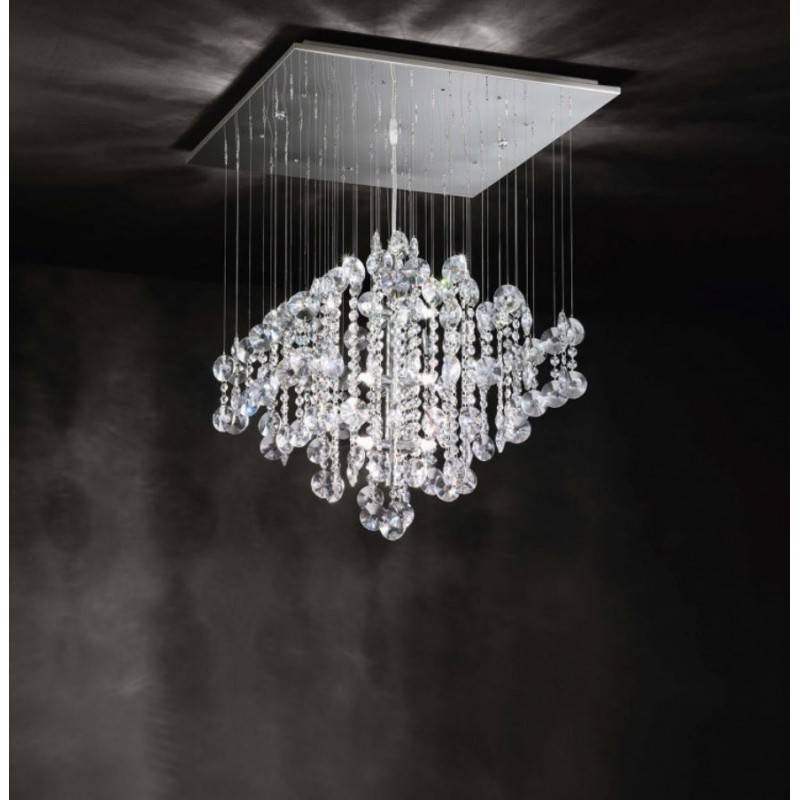 La plafoniera a 9 luci della serie ROTONDO di Affralux prende il nome dal tipo di cristallo utilizzato che é a taglio rotondo. Struttura in metallo cromato con piastra riflettente in acciaio inox lucidata a specchio.