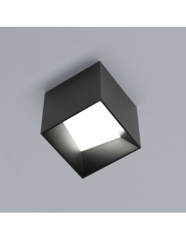 La plafoniera CUBE del marchio VIVIDA INTERNATIONAL presenta una struttura a forma di cubo realizzata in alluminio finitura nero e diffusore in acrilico.