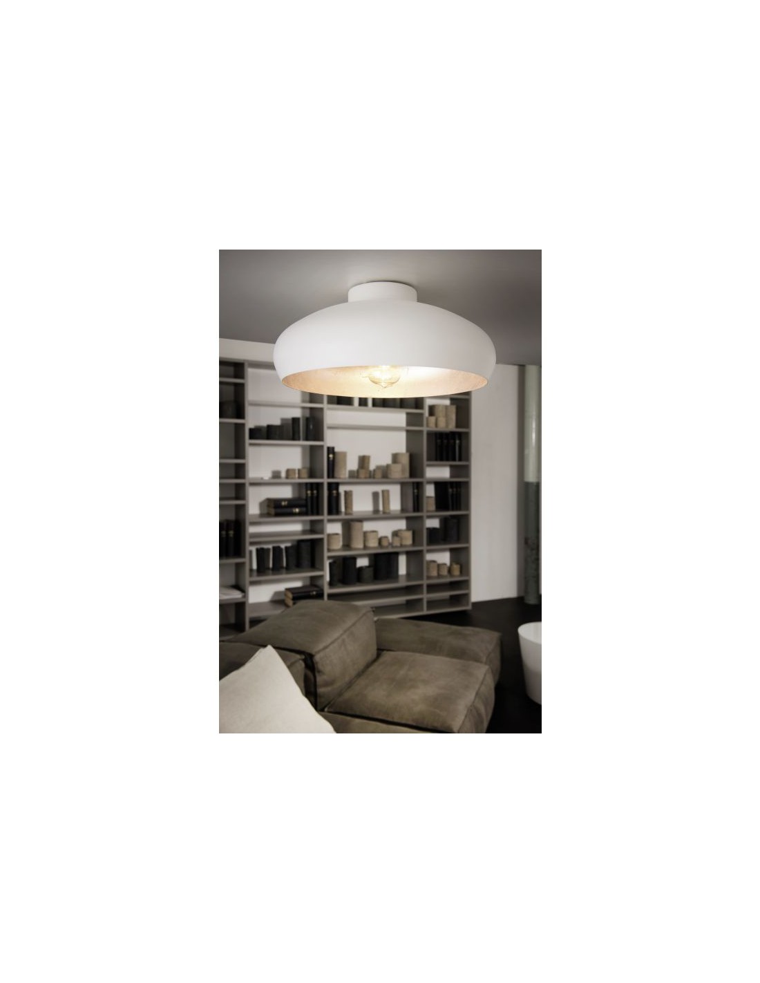 La lampada da soffitto MOGANO del brand Eglo presenta una struttura rotonda in metallo esternamente bianco e all’interno color argento.