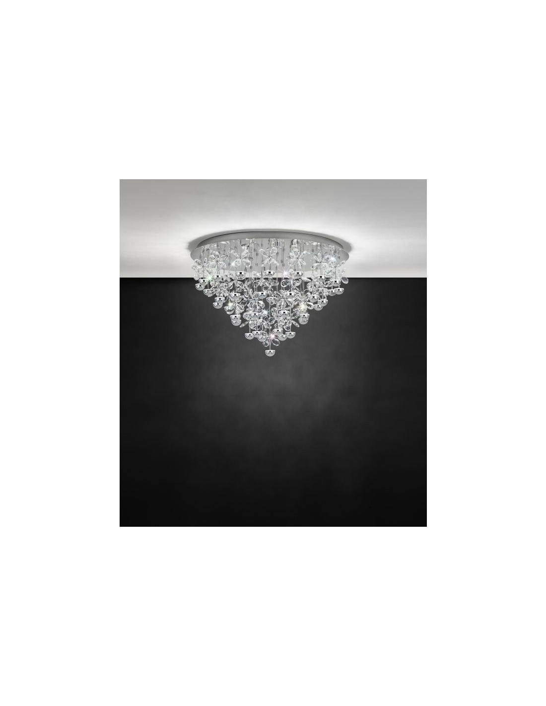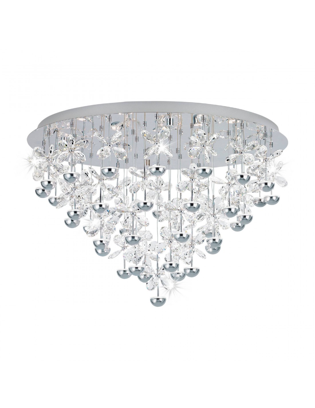 La lampada da soffitto PIANOPOLI del brand EGLO presenta una struttura in metallo finitura cromo, con piastra rotonda e diffusore con gocce decorative in cristallo molato.