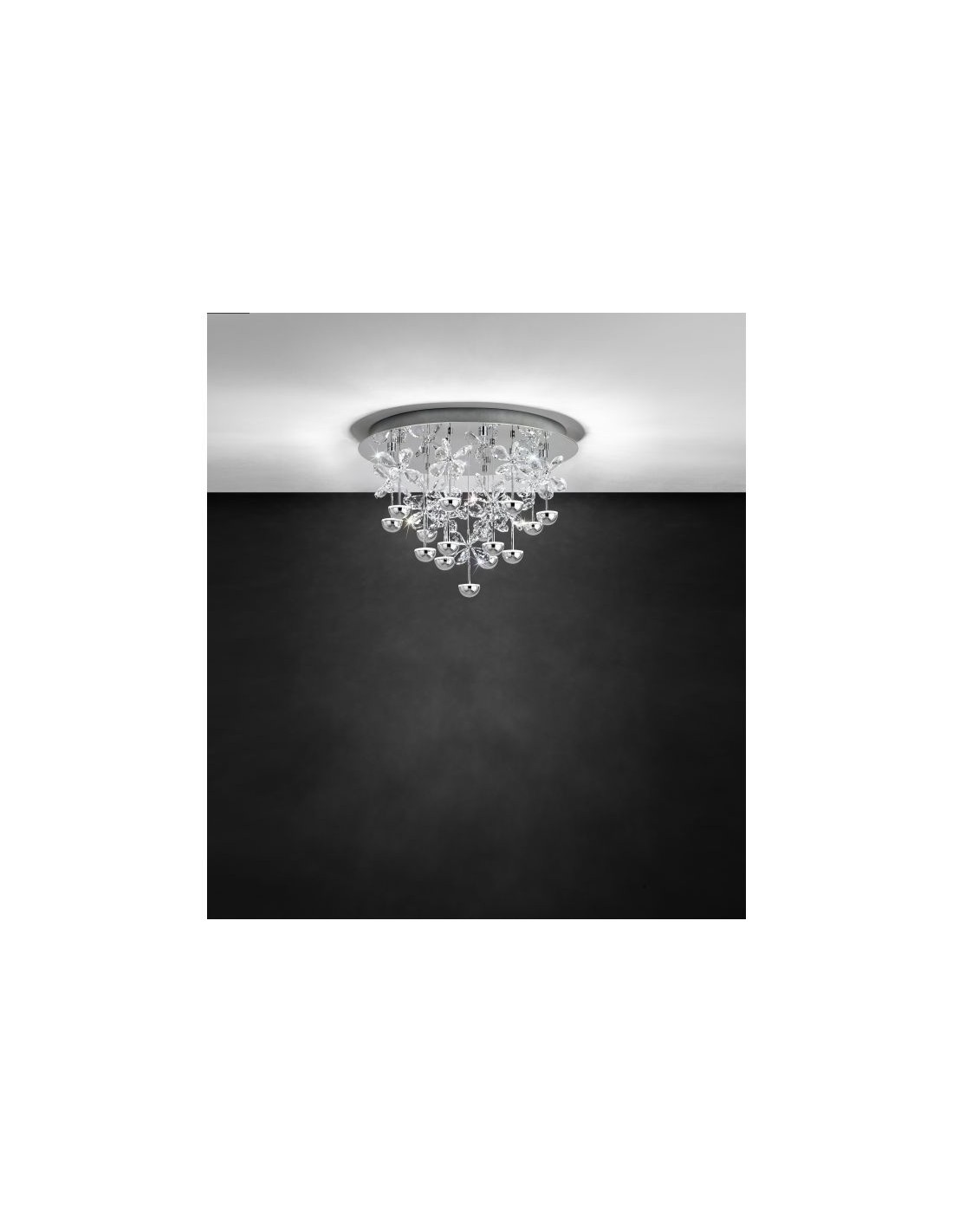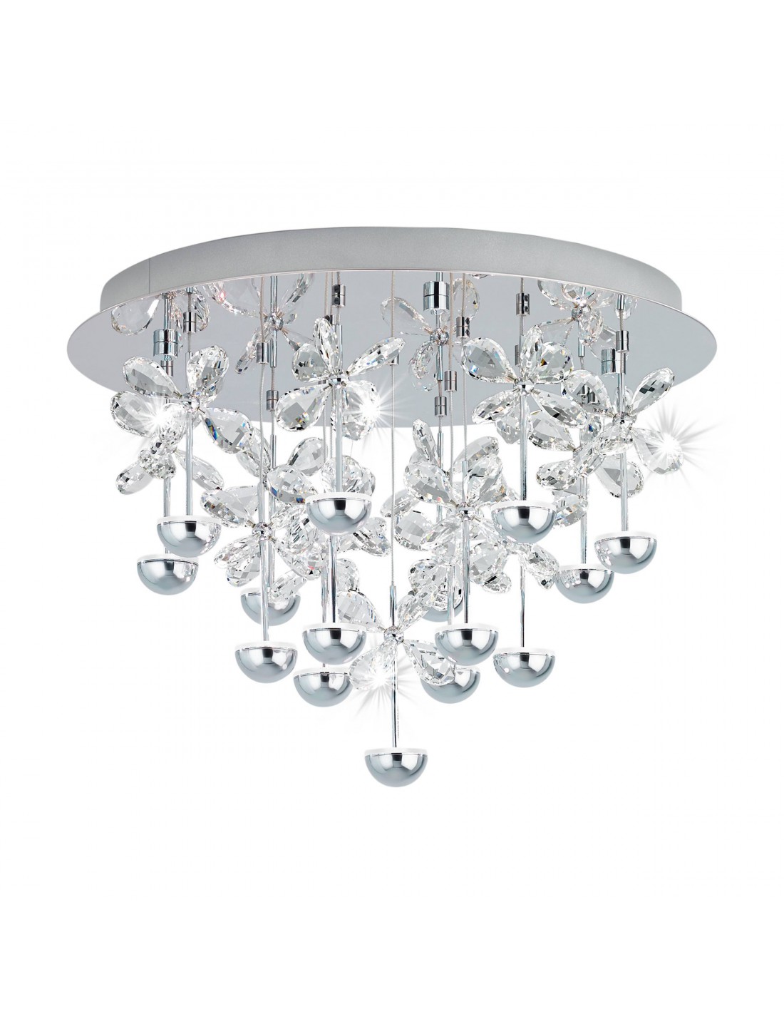 La lampada da soffitto PIANOPOLI del brand EGLO presenta una struttura in metallo finitura cromo, con piastra rotonda e diffusore con gocce decorative in cristallo molato.