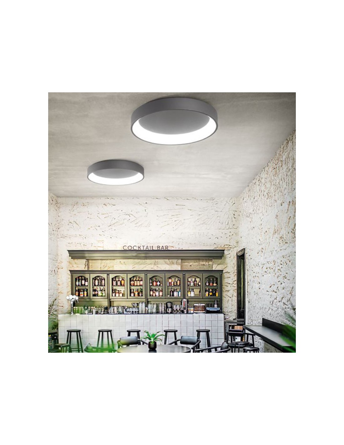Plafoniera della serie BAND DIODI di Affralux, realizzata con struttura rotonda in alluminio verniciato grigio antracite finitura satinata e diffusore interno in PMMA.