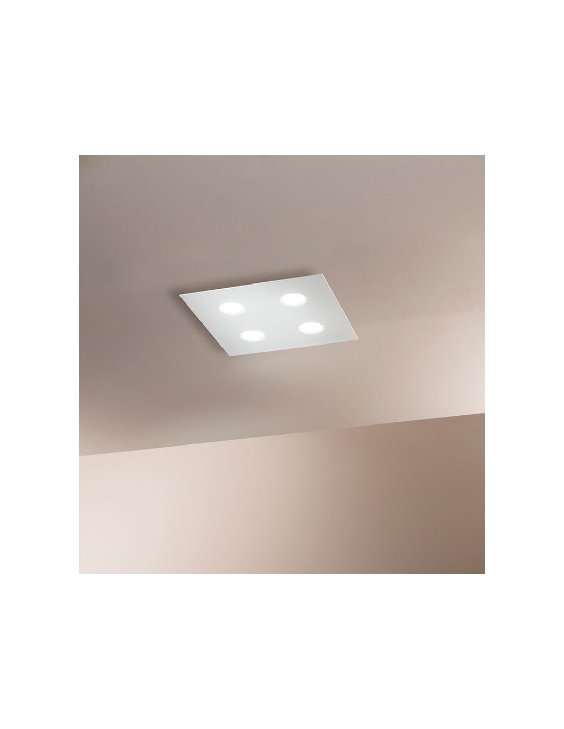 Plafoniera 4 luci della serie FLET di Affralux, composta da una piastra quadrata realizzata in alluminio verniciato bianco finitura sabbiata.