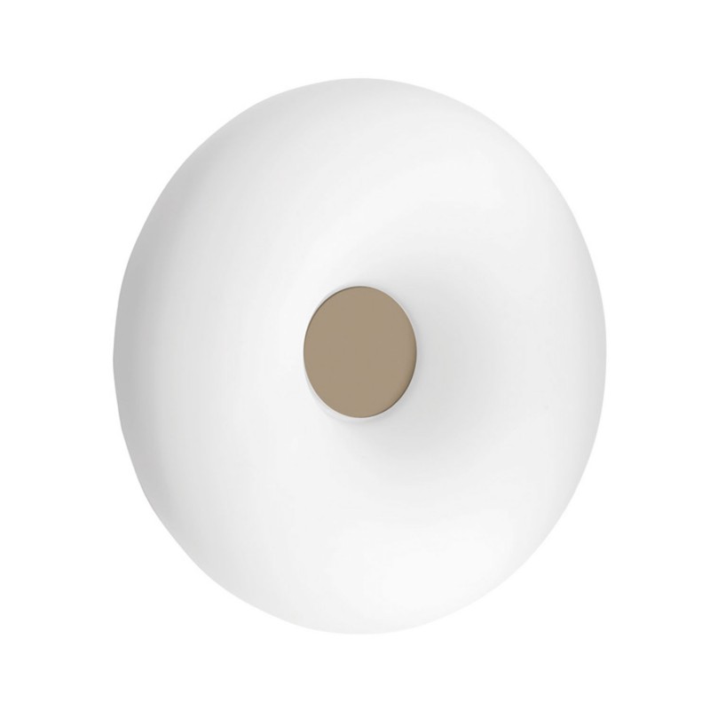 • La plafoniera della serie DODI é composta da un diffusore circolare a forma di anello realizzato in vetro soffiato ed acidato bianco. Tre decorazioni centrali incluse: bianco, tortora, nero.