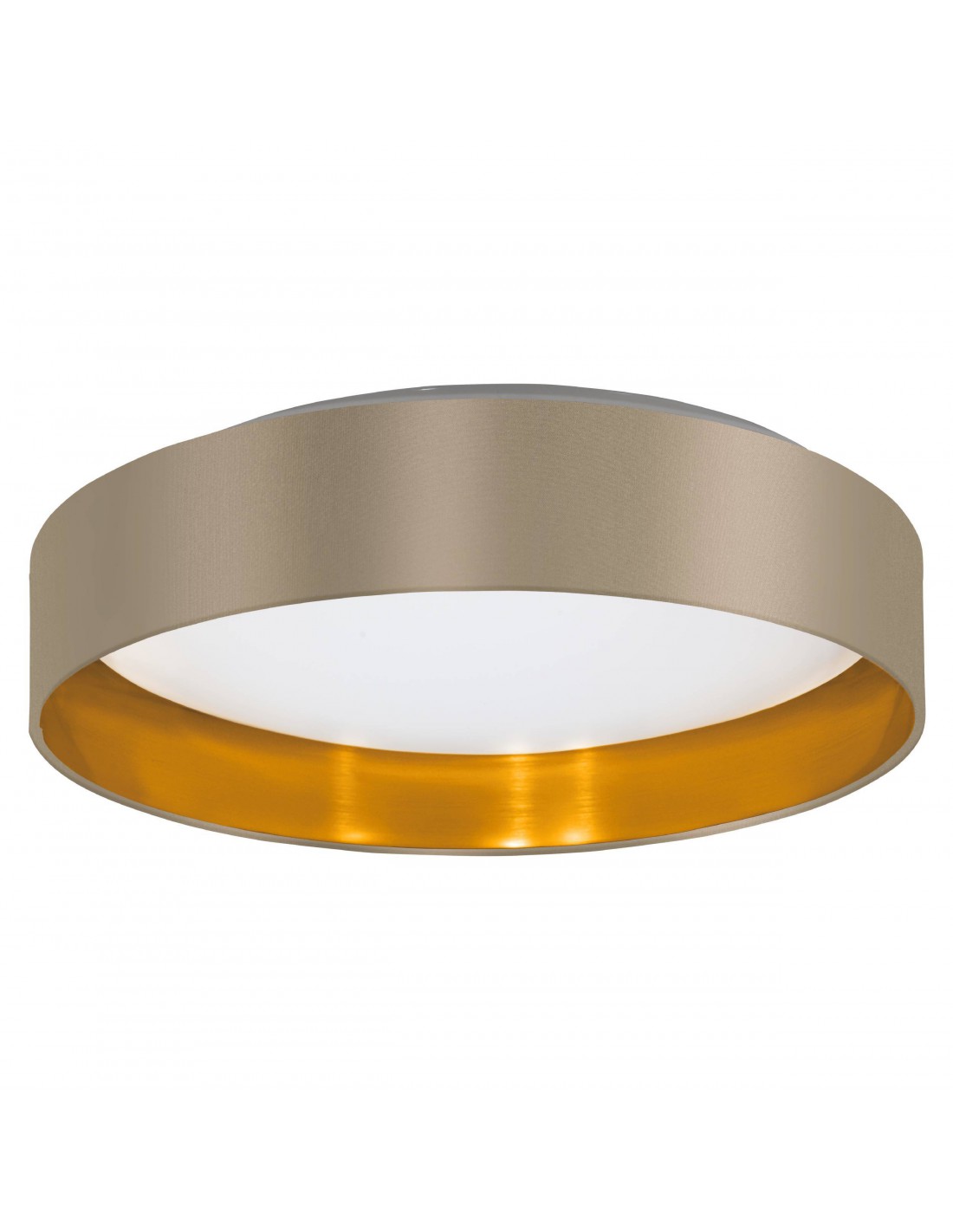 La plafoniera MASERLO del brand EGLO presenta una struttura rotonda in metallo e policarbonato finitura bianco e paralume dal diametro di Ø38 cm in tessuto tortora con interno color oro.