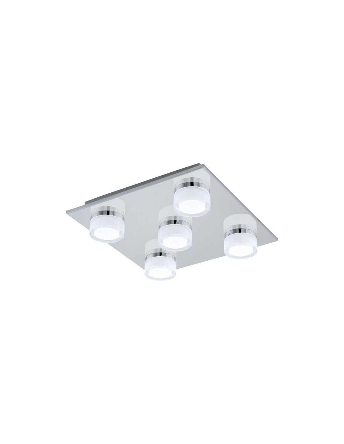 La plafoniera da soffitto ROMENDO del brand EGLO presenta una montatura quadrata in metallo cromato e 5 diffusori in policarbonato chiaro satinato.