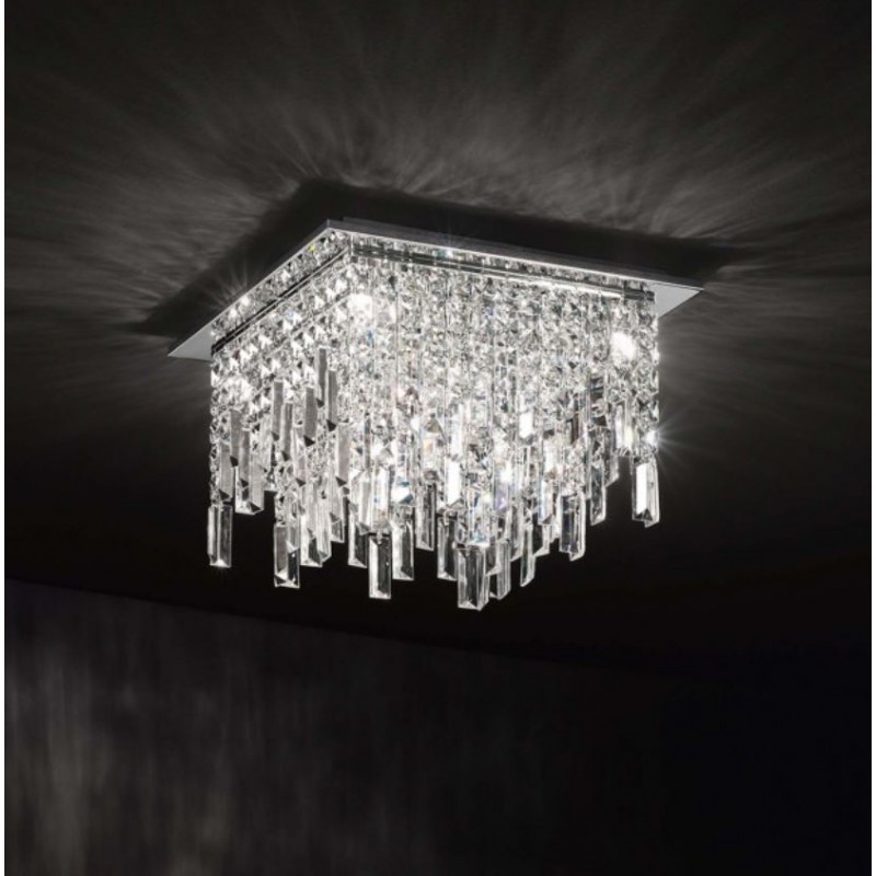 Plafoniera a 8 luci della serie FRANGIA di Affralux, realizzata con struttura in metallo, piastra quadrata in acciaio inox lucidata a specchio e pendenti di cristallo a mattonella con finale a losanga.