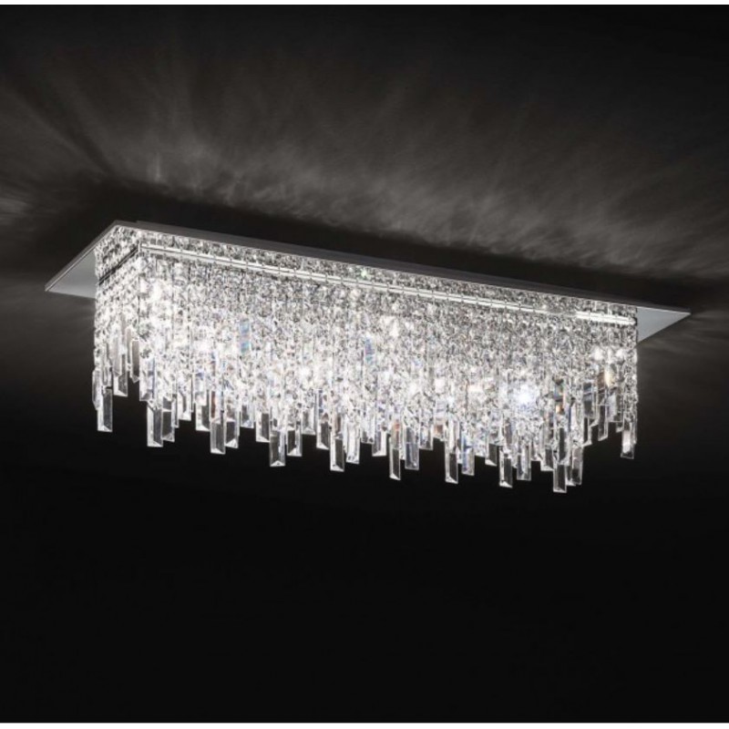 Plafoniera a 10 luci della serie FRANGIA di Affralux, realizzata con struttura in metallo, piastra rettangolare in acciaio inox lucidata a specchio e pendenti di cristallo a mattonella con finale a losanga.