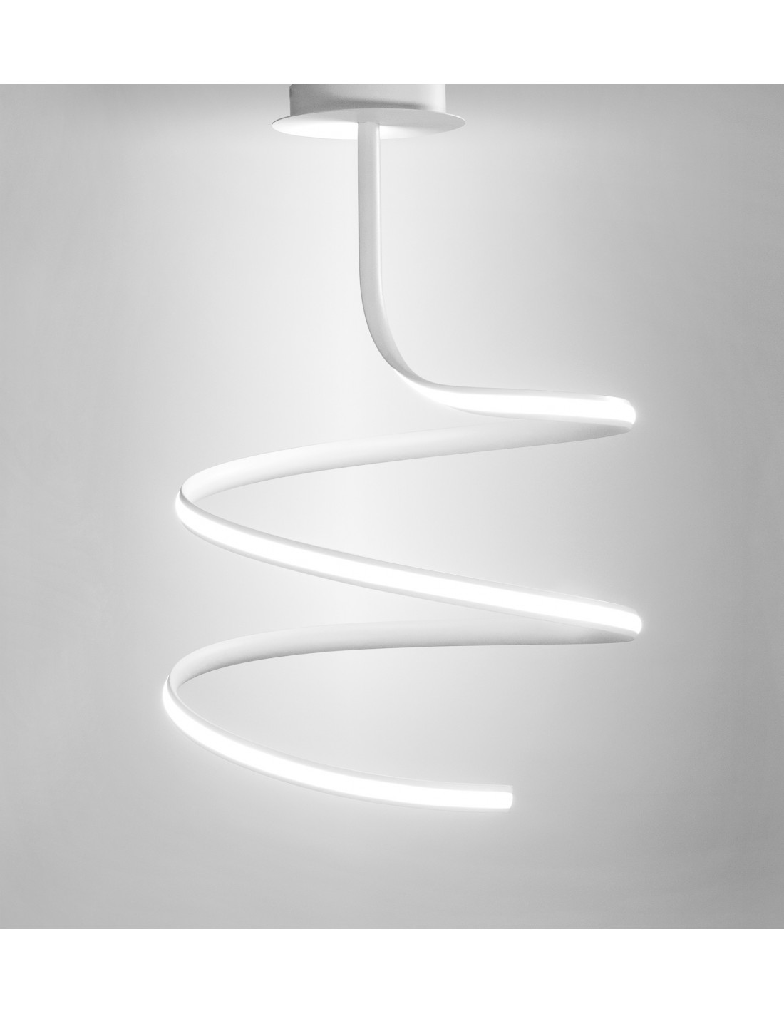Questa plafoniera RIBBON è formata da una montatura in alluminio finitura bianco composta da piastra rotonda e diffusore Led in silicone in tinta con la struttura dalla forma che richiama una spirale.