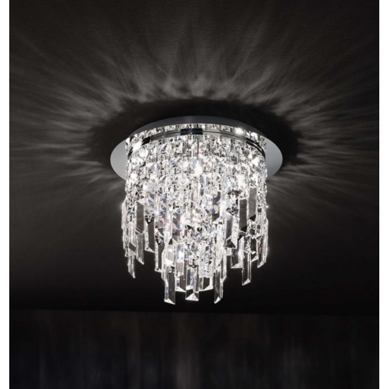 Plafoniera a 6 luci della serie FRANGIA di Affralux, realizzata con struttura in metallo, piastra rotonda in acciaio inox lucidata a specchio e pendenti di cristallo a mattonella con finale a losanga.