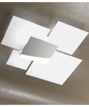 Plafoniera serie SHADOW, composta da 4 lastre quadrate in vetro extrachiaro bianco e una piastra frontale in acciaio lucido. Struttura in metallo verniciato bianco.