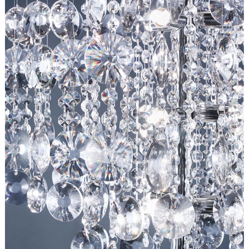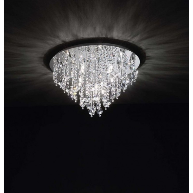 La plafoniera a 12 luci della serie ROTONDO di Affralux prende il nome dal tipo di cristallo utilizzato che é a taglio rotondo. Struttura in metallo cromato con piastra riflettente in acciaio inox lucidata a specchio.
