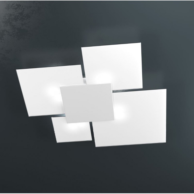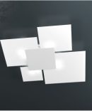 Questa plafoniera della collezione Upgrade è composta da 4 elementi di forma quadrata realizzati in vetro extrachiaro bianco con una piastra frontale decorativa in metallo disponibile in diverse finiture: bianco, grigio, sabbia, marrone, grigio antracite, foglia argento, foglia oro e foglia rame.