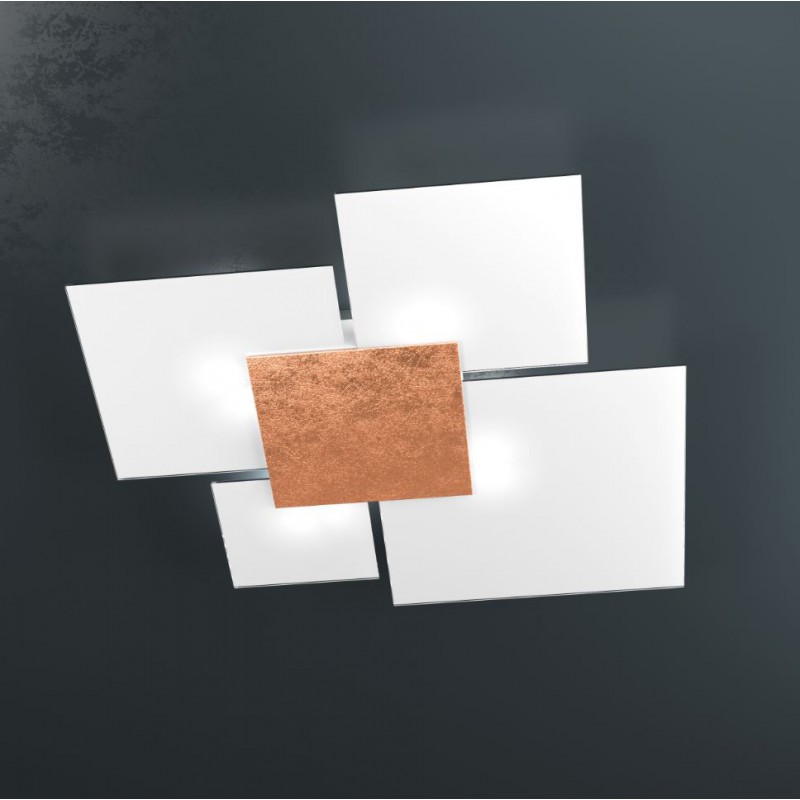 Questa plafoniera della collezione Upgrade è composta da 4 elementi di forma quadrata realizzati in vetro extrachiaro bianco con una piastra frontale decorativa in metallo disponibile in diverse finiture: bianco, grigio, sabbia, marrone, grigio antracite, foglia argento, foglia oro e foglia rame.
