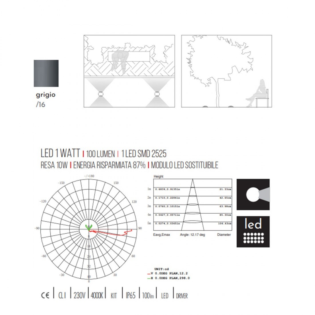 I LED sono particolarmente interessanti per le loro caratteristiche di elevata efficienza luminosa A .U./A e di affidabilità. L’evoluzione dei materiali è stata quindi la chiave per ottenere sorgenti luminose che hanno le caratteristiche per sostituire quasi tutte quelle ad oggi utilizzateL’istallazione è prevista con picchetto a terra.La manutenzione risulta estremamente facile usando un semplice panno inumidito con dell’acqua.