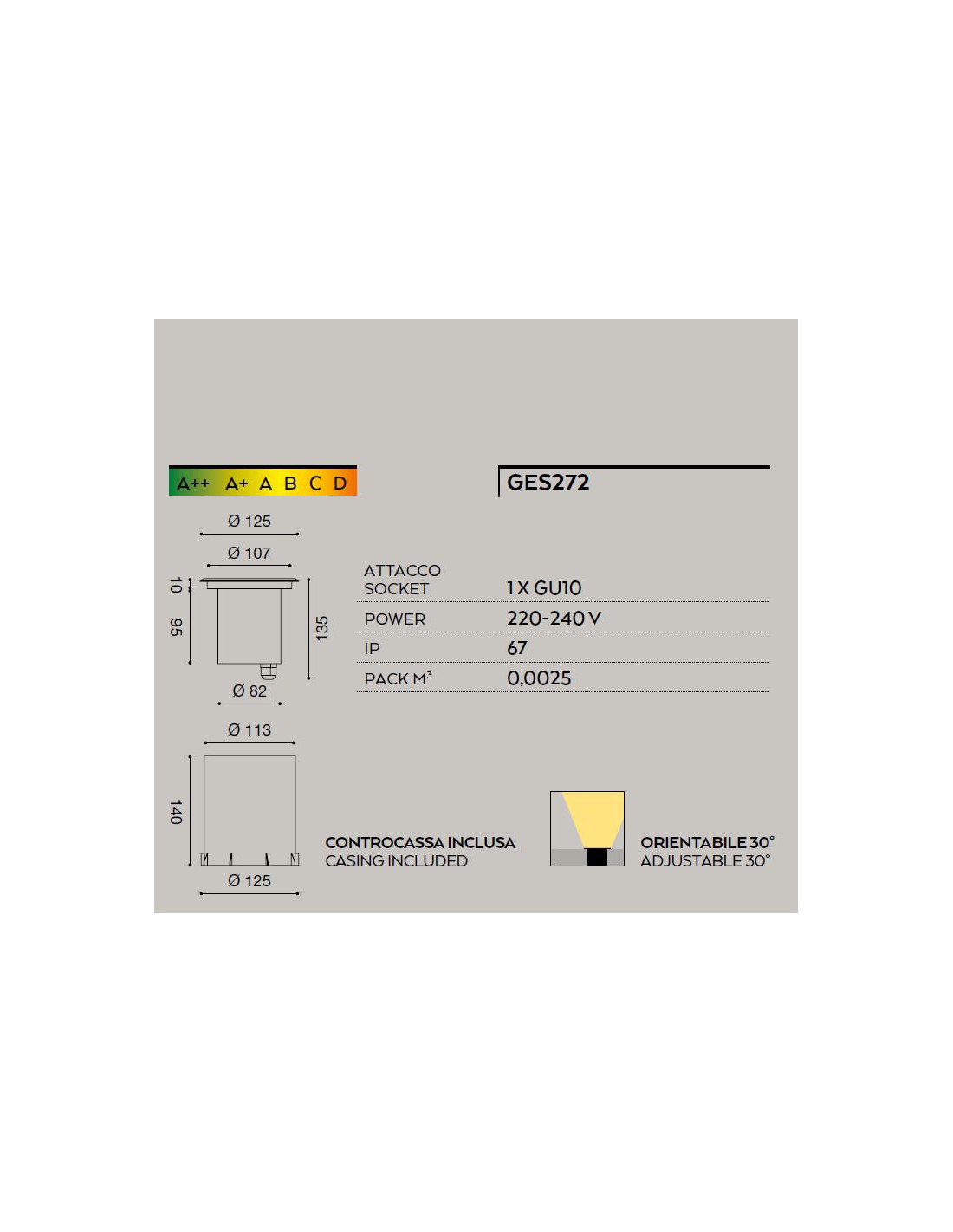 Cover in acciaio inossidabile AISI 306 e diffusore in vetro satinato temperato. Calpestabile e orientabile a 30°. Controcassa per il montaggio inclusa.