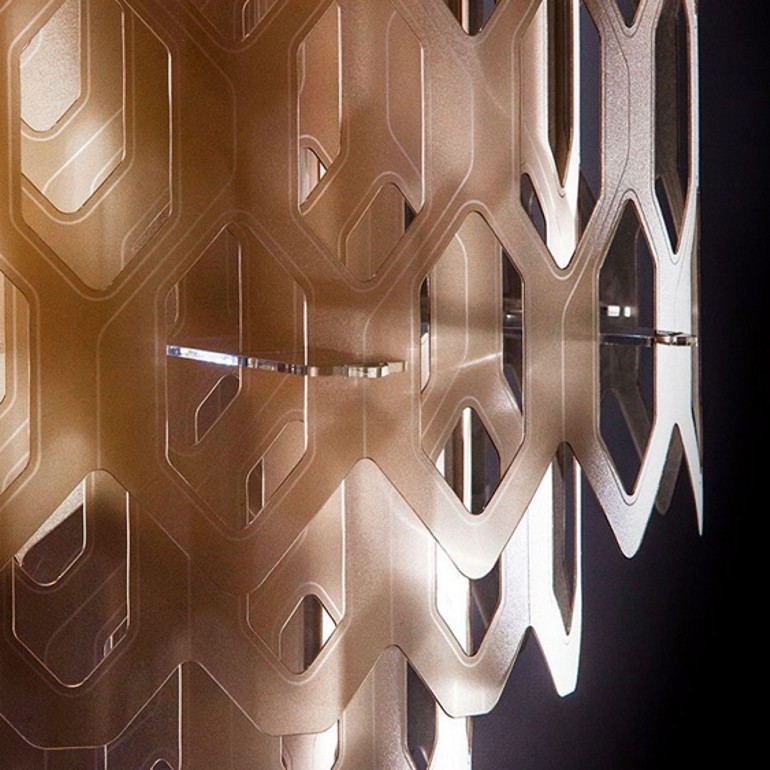 Sospensione CHANTAL di SLAMP. Chantal Small firmata da Doriana e Massimiliano Fuksas, uno dei più importanti studi di design, è una lampada a sospensione caratterizzata da un diffusore composto da forme esagonali concentriche che creano una prospettiva cangiante in base al punto da cui la si guarda, modellandosi in un unico volume che richiama il nido d’ape e trasformando un elemento bidimensionale in volumi che si moltiplicano all’infinito.. Chantal Small inserita all’interno di qualsiasi arredamento domestico, ma soprattutto in locali pubblici come negozi, ristoranti e bar, armonizza gli spazi e li valorizza, infondendo carattere e personalità all’ambiente.La luce definisce con precisione il volume attraversando il pattern forato del suo design fino a ricreare un’ipnotica successione di ombre e riflessi. L’attacco magnetico permette di manutenere e pulire il prodotto con facilità e disinvoltura. Chantal sospensione è disponibile in 2 diverse dimensioni.