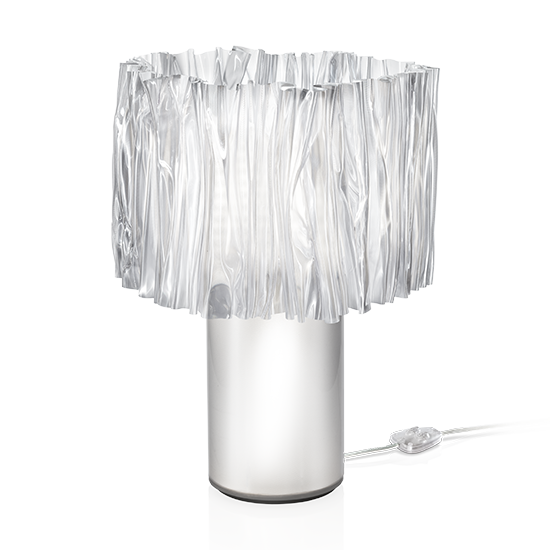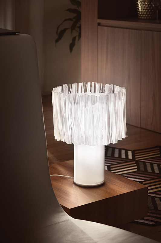 Lampada da tavolo ACCORDEON TABLE di SLAMP. Accordéon Table è una lampada da tavolo dal design contemporaneo. Il diffusore è realizzato plissettando con le mani il tecnopolimero Lentilflex®. Lo stelo della lampada è ideato per diventare esso stesso un ulteriore diffusore di luce, che si accende indipendentemente dal cappello. Tramite sistema magnetico, il cappello si può staccare con un click per pulirlo con facilità. Disponibile anche nella versione a sospensione.