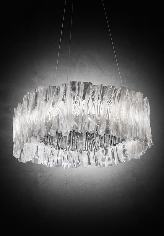 Sospensione moderna ACCORDEON di SLAM dal design moderno, Il lampadario è formato da due cerchi concentrici, quello esterno è in Lentiflex® con effetto prismatico, quello interno è disponibile in 3 colorazioni. Entrambi gli elementi sono realizzati plissettando a mano il materiale e scaldandolo a temperatura controllata. Il circuito a LED integrato è dimmerabile e disponibile sia a 2700 che a 3000 Kelvin. Disponibile anche in versione da tavolo