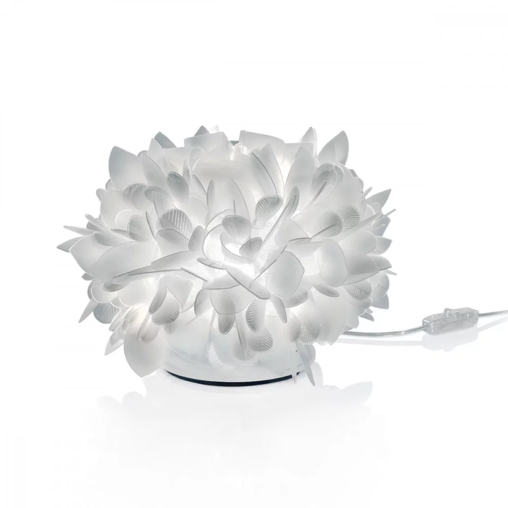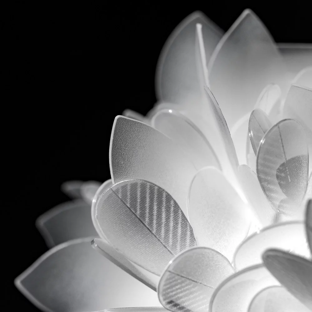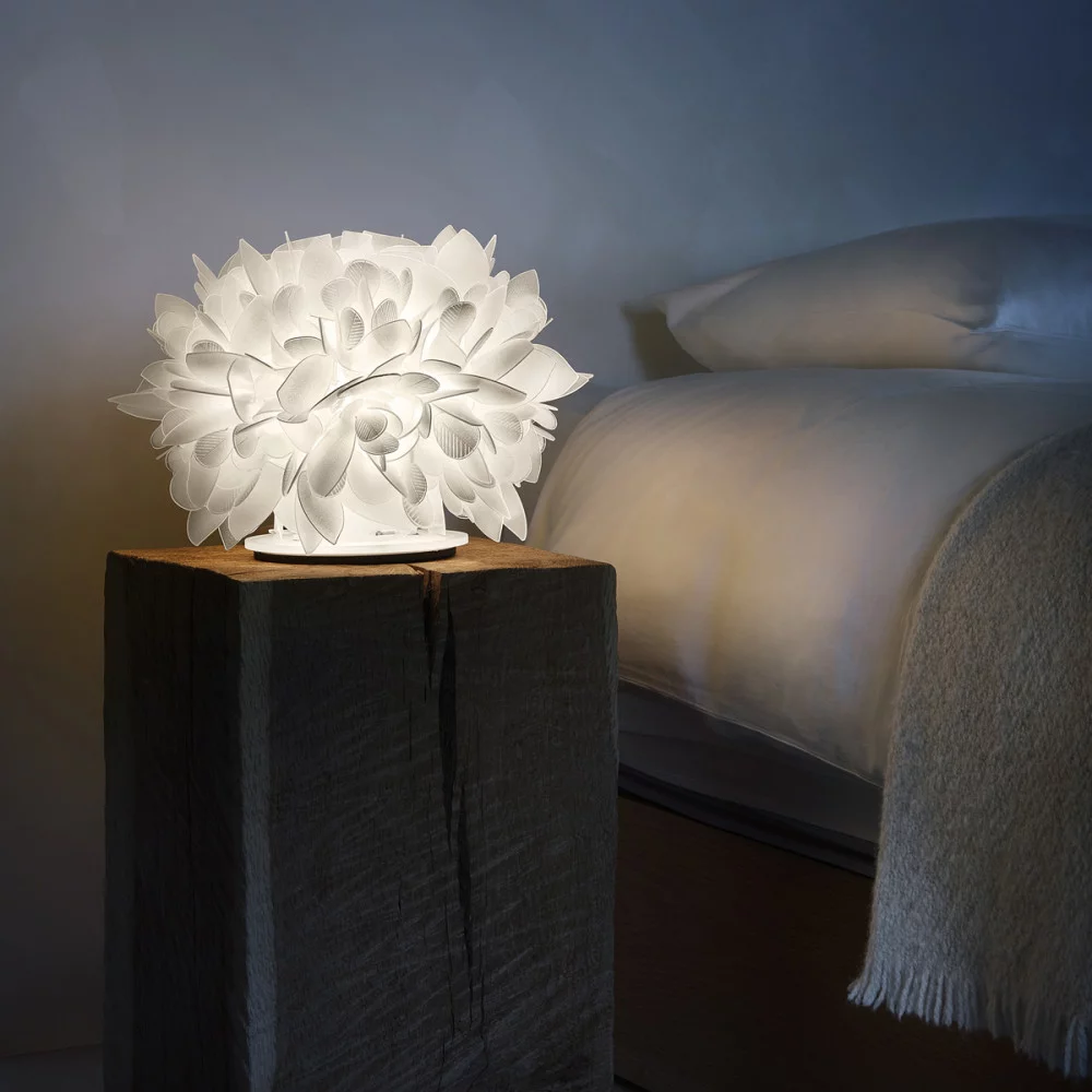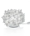 Lampada da tavolo VELI di SLAMP nella nuova versione Foliage, Realizzata con 268 incastri realizzati completamente a mano, la collezione è un connubio tra la morbidezza del mondo sartoriale di Veli e la perfezione del mondo naturale.Veli TABLE è ideale come lampada da comodino per camera o cameretta, elegante e allo stesso tempo leggera e gradevole.