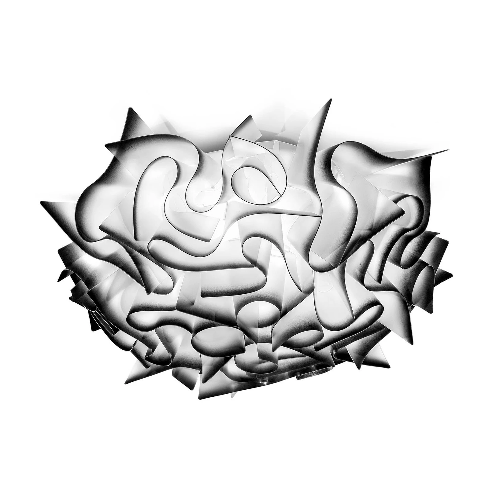 Plafoniera VELI di SLAMP. Una finitura morbida che si ispira alle texture dei tessuti moderni. Veli Copper plafoniera diametro 78 cm black relizzate in Goldflex®, Steelflex® e Copperflex® i tecnopolimeri metallizzati brevettati da Slamp che donano pregio e lucentezza. Si ispira alla morbidezza dei tessuti e delle stoffe, progettando un sistema di montaggio che viene eseguito a mano tramite incastri e senza punti di giuntura a vista. Il risultato è una collezione glamour, sofisticata ed esclusiva che si trasforma da fonte di luce a elemento decorativo, garantendo luminosità e riflessi nobili ad ambienti domestici e grandi spazi.