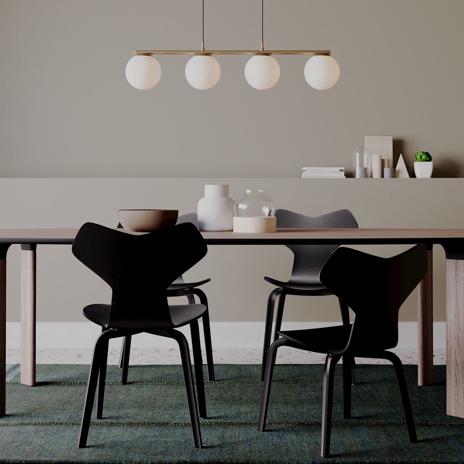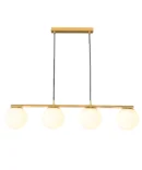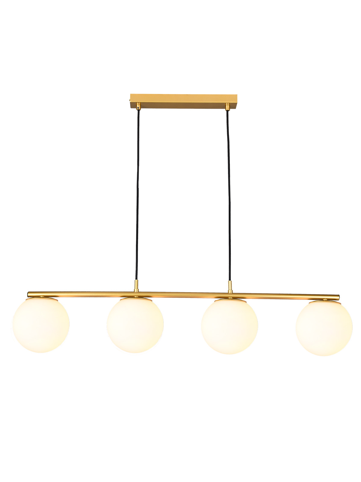 Lampadario serie BOWLING firmato dal brand Smarter Lighting di Redo Group composto da binario in metallo verniciato oro opaco impreziosito da 4 diffusori sferici in vetro soffiato bianco opalino disposti in linea.